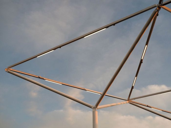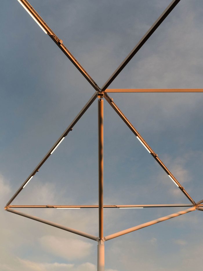 The system consists of a set of bars supported by an aggregation of repeating metal trees. Each tree is made up of a tubular column connected to three inclined beams, or branches, which place the vertices of the frame where the converging bars lay.
