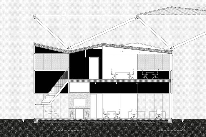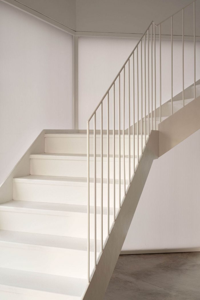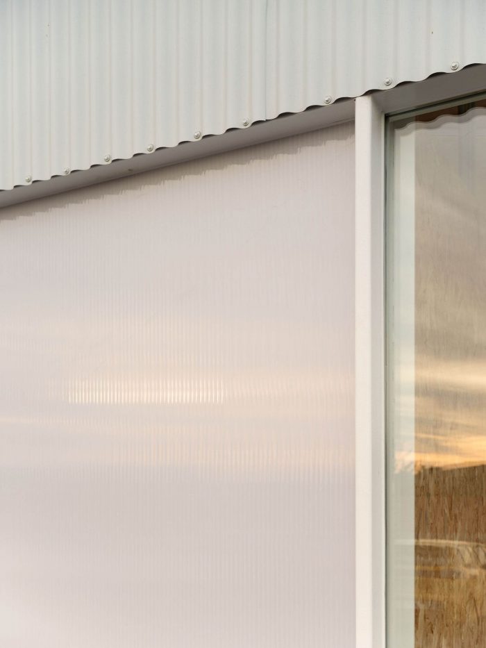另一方面,工作大楼被分为两层。在下层,有一个会议和休息区以及一个拍摄车辆的空间。上层则是办公室。由于这个空间的特点,与车间不同的是,内部覆盖着隐藏支撑结构的饰面,并提供保温。在底层,外墙从地面升起,留下一个向外开放的视觉带。在上面,一个水平条纹的窗户让工作的最佳光线通过板材过滤后进入。