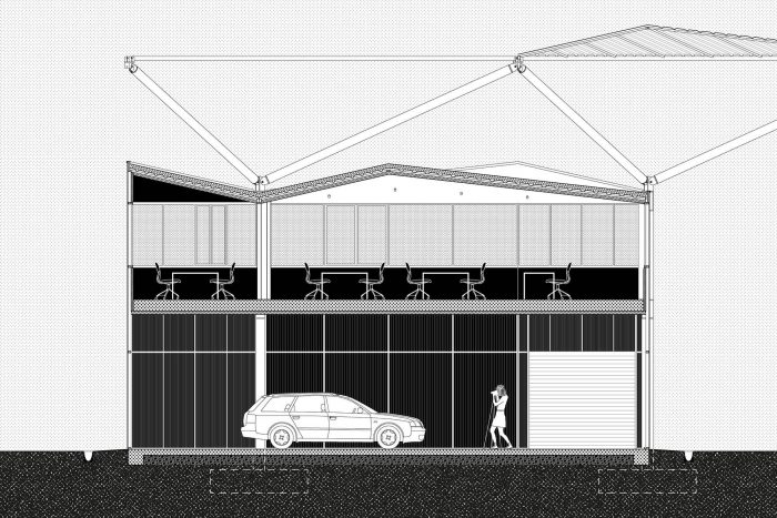 建筑物的围墙是由放置在固定在柱子上的型材上的微孔板组成的。屋顶是由与结构对话的三角形平面组成的,使用夹层板。这四座建筑被分为两组:一组是机械车间区,另一组是办公室。车间利用了建筑物的全部高度。这被用来定位一个车辆升降系统,以及一个隔离的油漆室。
