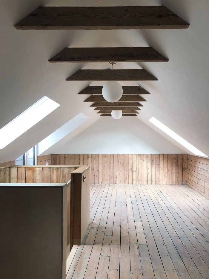 通过抢救、恢复和重新使用现场发现的许多建筑元素,以及应用可回收材料和限制水泥的使用,减少了垃圾填埋和碳的体现。在石膏板墙内发现的木板被安装在通往阁楼的老式卷帘楼梯周围作为墙面覆层;不太好的地板被翻转90度作为阁楼低墙的覆层,屋顶拉杆被暴露出来,与回收的木制品放在一起,窗户被重新悬挂并重新安装了超薄的双层玻璃和新的密封条;老式马厩门被修复,用新制作的真实铰链从原来的铸件上铸造。