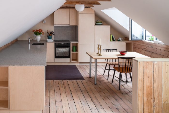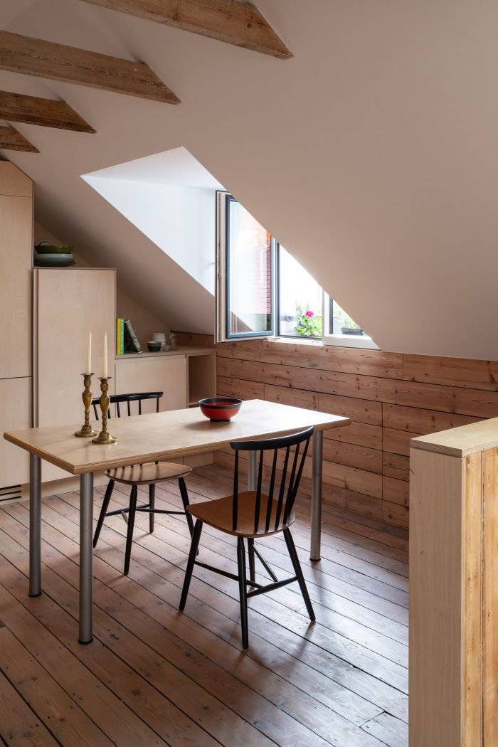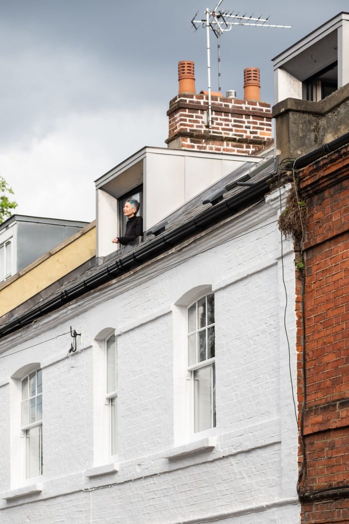 The building envelope is fully insulated and sealed with taped internal OSB and fitted with a whole-house MVHR system. The old brickwork is independently ventilated through the pointing weep holes. The open-plan boat-like cooking/living space on the top floor is roofed with reclaimed slates. On the roof, solar hot water panels are recessed into the southern pitch while a pair of heavily insulated, yet quietly modern dormers sit on the North-facing pitch. Though identical from the street, one dormer hides a full-height French door by the sitting area while the other, a smaller window with a herb garden by the kitchen. The openings are carefully calibrated to maximise light from the North and South.