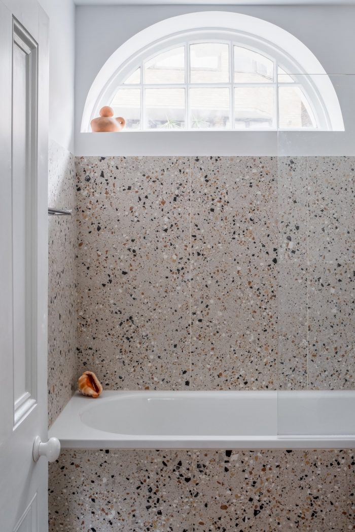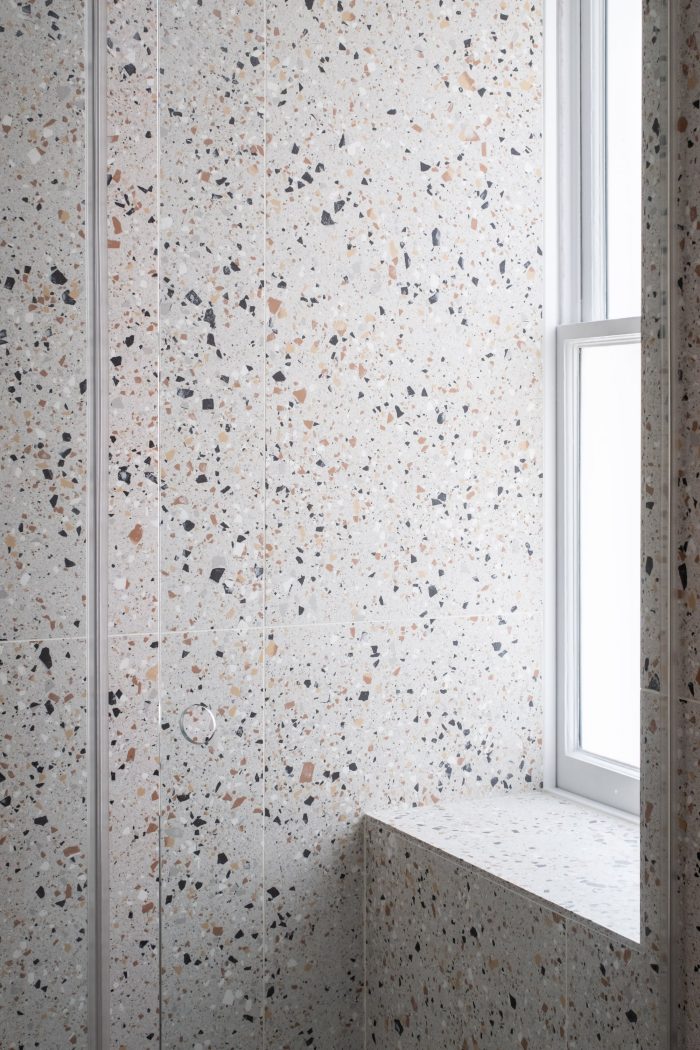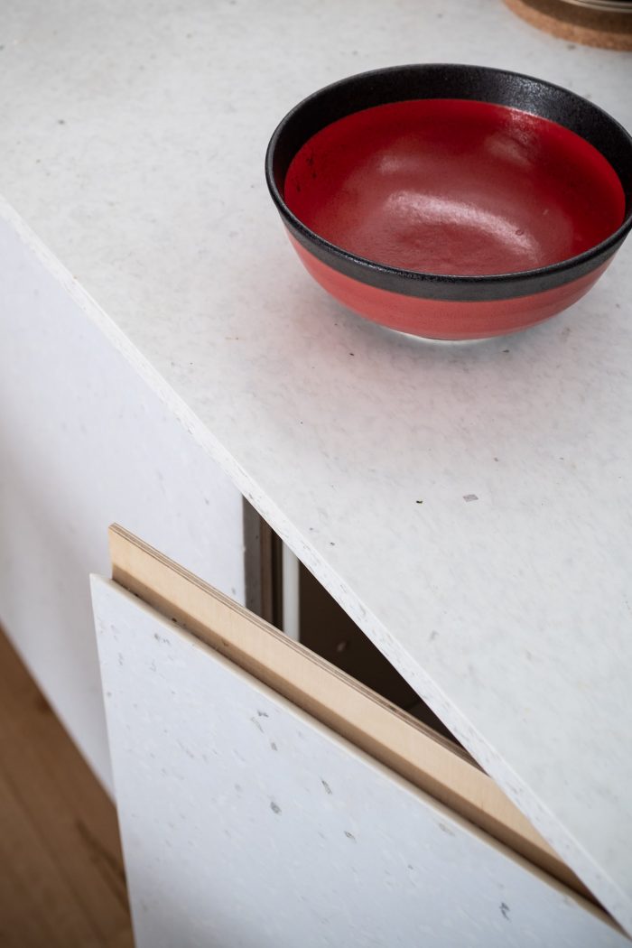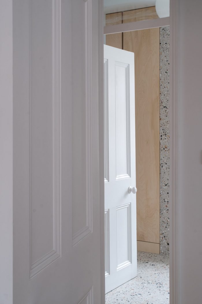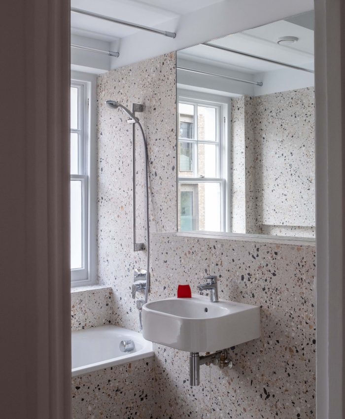 Behind these doors, new triple glazed windows and doors complete the efficient thermal envelope letting maximum daylight into the space within; instead of UFH cast into a screed, thin pre-grooved rigid panels float directly on the thick floor insulation; a very simple palette of materials includes terrazzo tiling with 40% recycled porcelain and recycled yoghurt pot boards as kitchen units and worktops; the Heat Pump-ready design. The increased thermal performance will allow for a transition from gas when public acceptance allows for use of heat pumps in conservation areas.