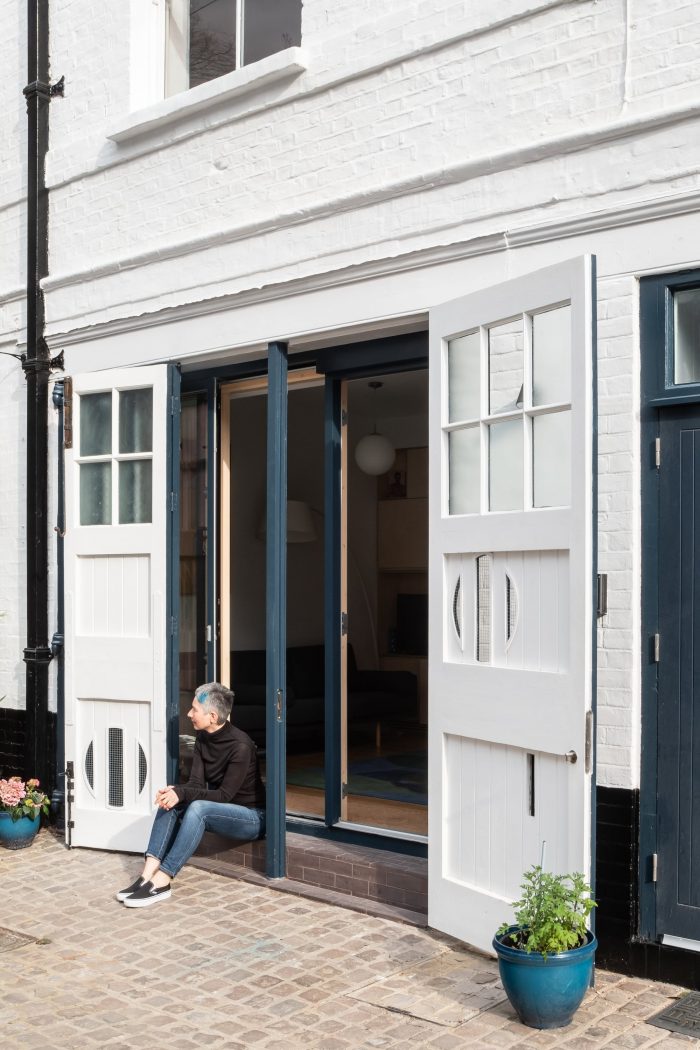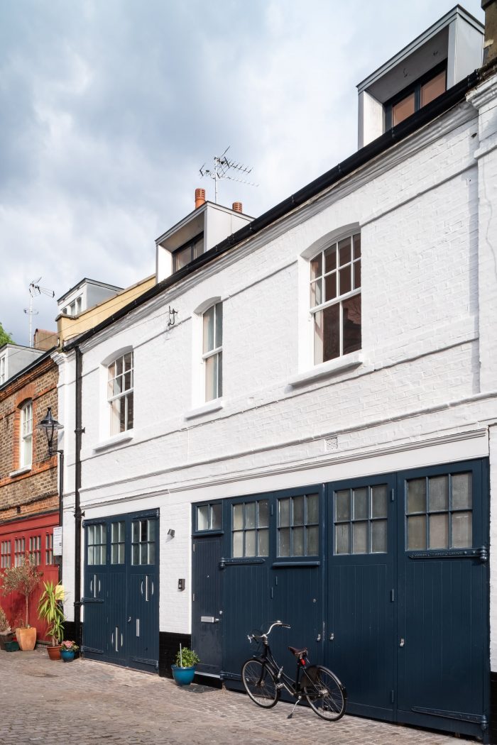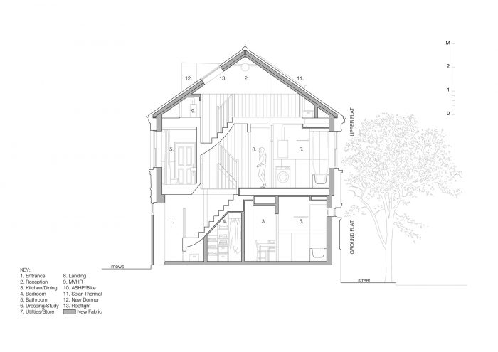 Originally Victorian stables with staff accommodation above, the mid-terrace mews building had been partially converted into a house in the 1980s. It included an un-insulated attic, an open garage-cum-store room on the ground floor and an extensive number of bathrooms throughout. The brief asked for an efficient, future-proofed, pair of self-contained homes with a break-through spot to inter-connect in the future. Above the 1-bed ground floor flat, the first occupants of the upside-down 4-bed maisonette are refugees fleeing conflict.