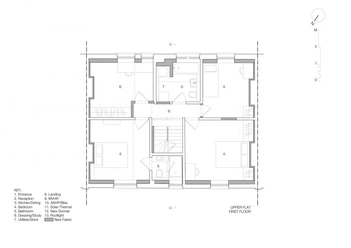 这座中层马厩原本是维多利亚时代的马厩,上面有工作人员的住所,在20世纪80年代被部分改造成房屋。它包括一个未隔热的阁楼,一个位于底层的开放式车库兼储藏室,以及大量的浴室。设计大纲要求设计一对高效的、面向未来的、独立的住宅,并在未来有一个突破性的地方可以相互连接。在底层1个床位的公寓之上,倒置的4个床位的小公寓的第一批住户是逃离冲突的难民。