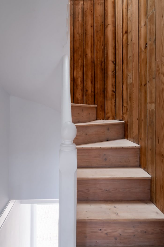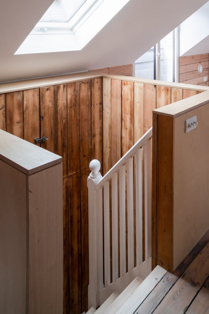 Landfill and embodied carbon are reduced through salvaging, restoring and re-using many building elements found on site, as well as applying recycled materials and limiting the use of cement. Timber boarding discovered within plaster-boarded walls is installed as wall cladding around the old winder staircase leading to the loft; the less good floorboards are turned 90º as cladding for the low loft walls, the roof ties are exposed to sit alongside the reclaimed timberwork, the windows are rehung and re-fitted with extra-slim double glazing and new seals; the old stable doors are restored with newly-made authentic hinges cast from the original castings.
