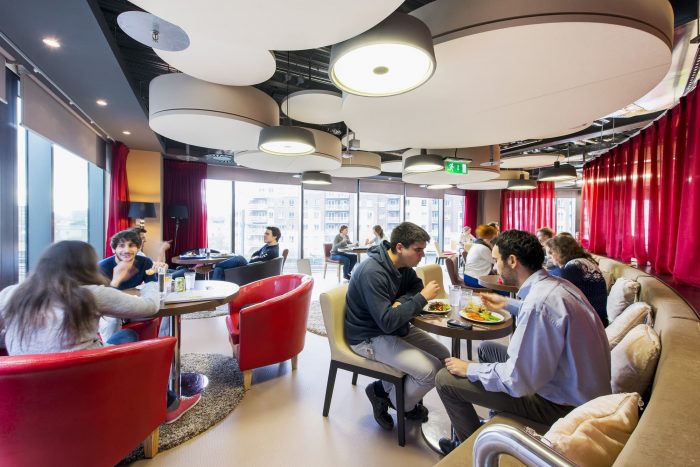 For the Masterplan the architects had to find a smart solution for the nearly impossible – to create a stimulating and interactive campus within a bustling environment in the midst of the inner city. Apart from innovative office spaces, the Masterplan required the successful organisation of a multitude of additional functions, such as 5 restaurants, 42 micro kitchens and communication hubs, game rooms, fitness center, pool, wellness areas, conference, learning & development centre, tech stops, over 400 informal and formal meeting rooms and phone booths, etc.
