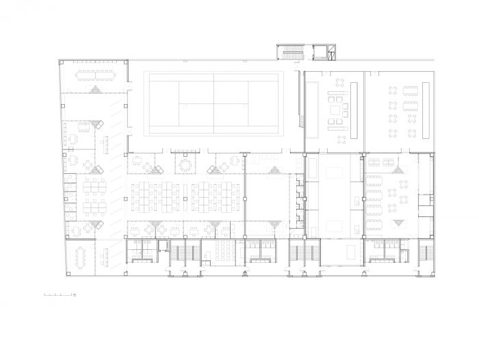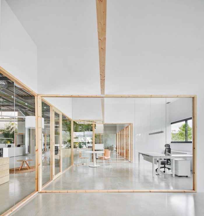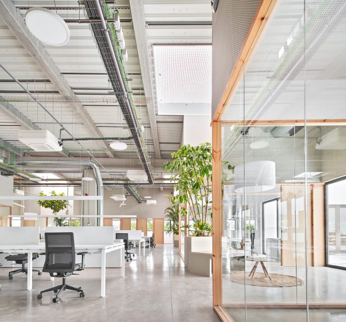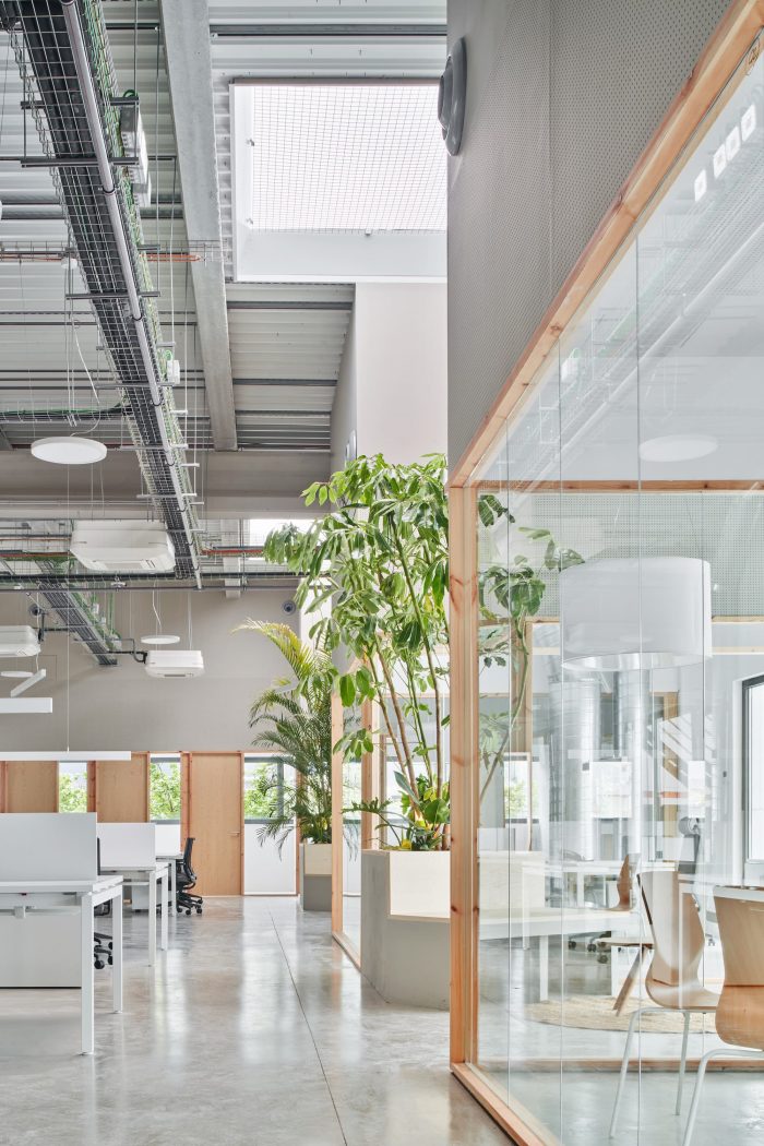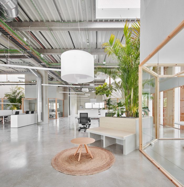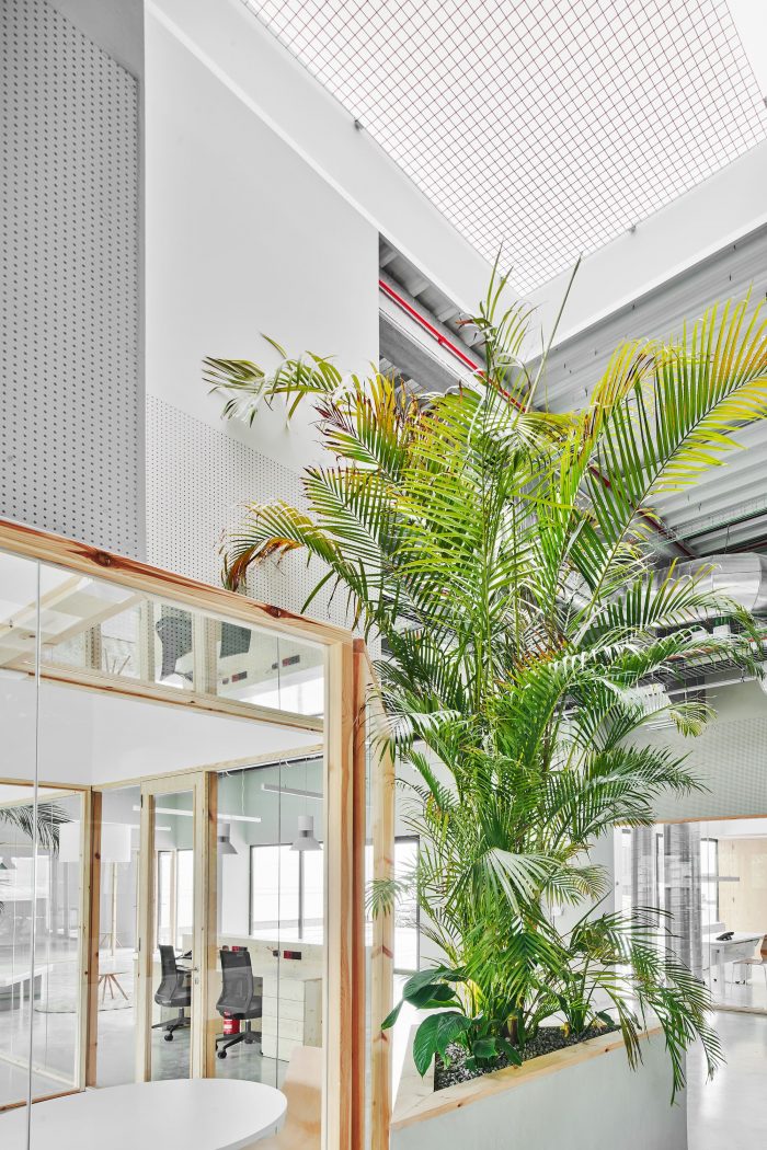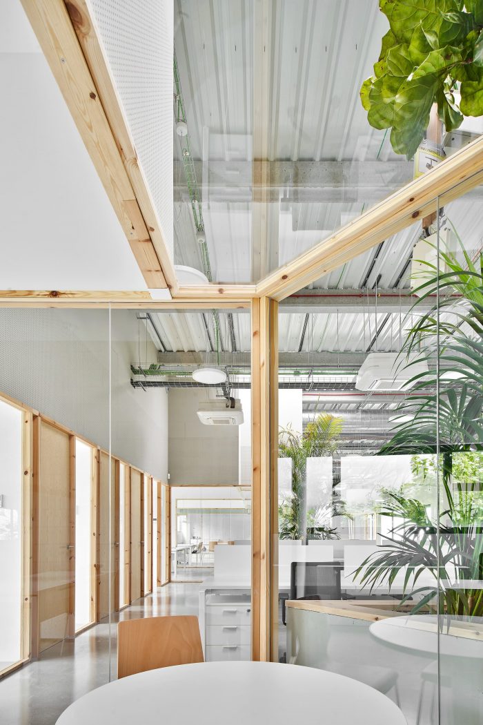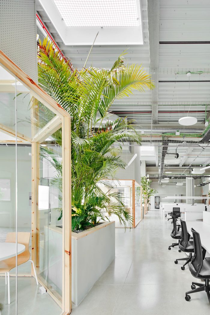 A diaphanous distribution and compartmentalization are projected for the use of open offices in which everyone is in visual contact. For this purpose, transparent views are prioritized with the use of glass. Only these visuals are interrupted by some large-format plant elements that are linked to the skylights on the ceiling.