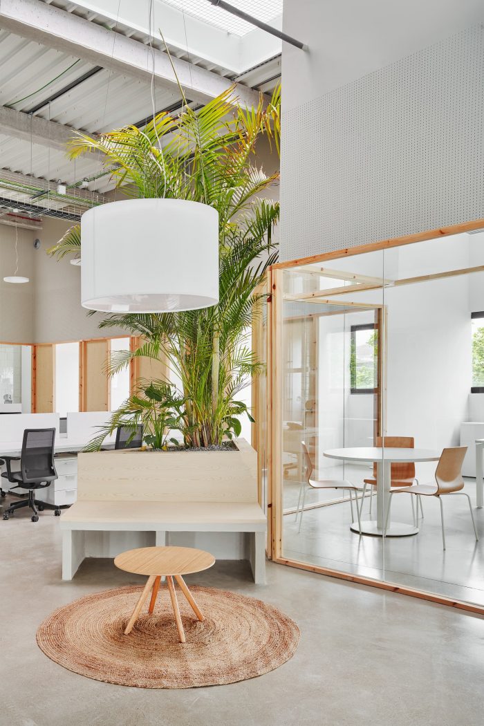 在开放的办公室里,每个人都会有视觉上的接触,这就需要一个透明的分布和分区。为此,玻璃的使用使透明的视野得到了优先考虑。只有这些视觉被一些与天花板上的天窗相连的大型植物元素所打断。