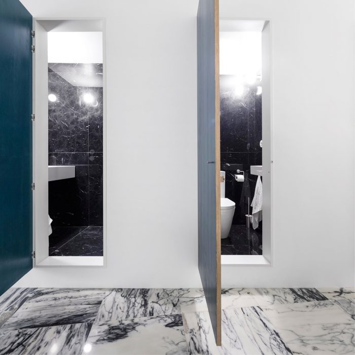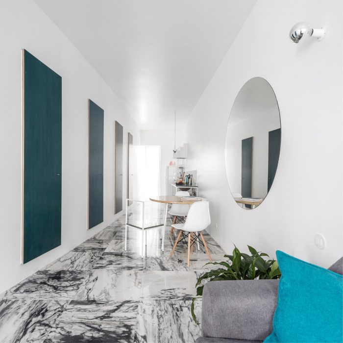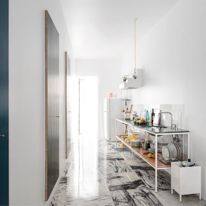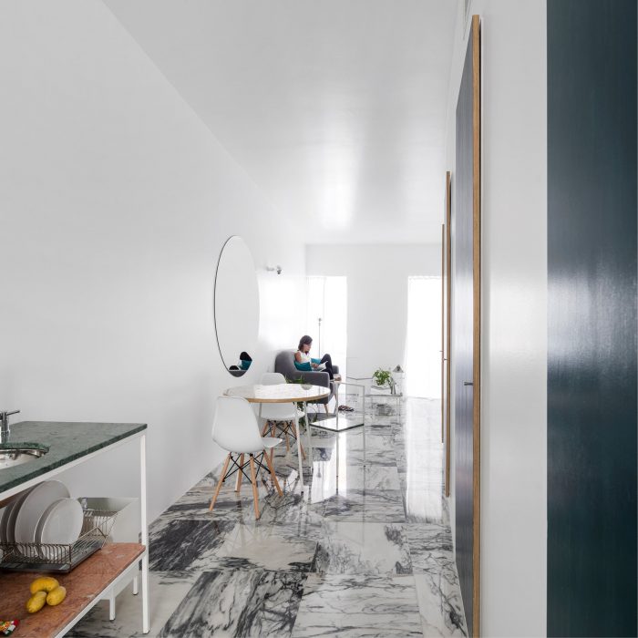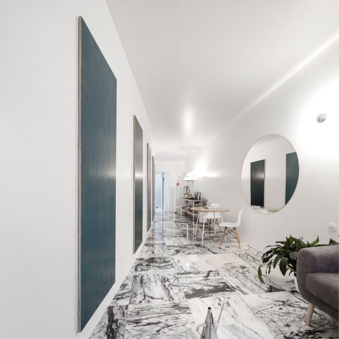 长长的主空间既是居住区,也是餐饮和厨房区;它是一个生活画廊,而不是一个客厅。它的弧形墙被不同色调的手绘门所点缀,像一组单色画一样从地板上垂下。曲线的轻盈和立面的僵硬之间存在着一种精心校准的冲突。