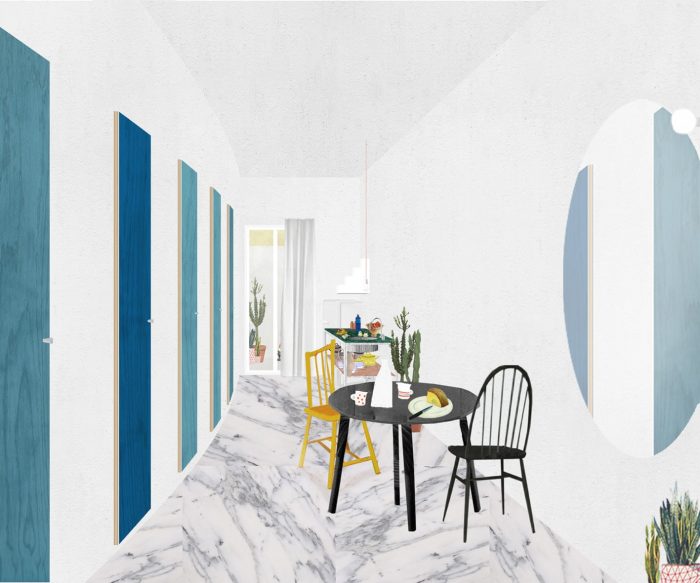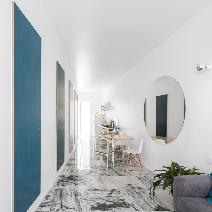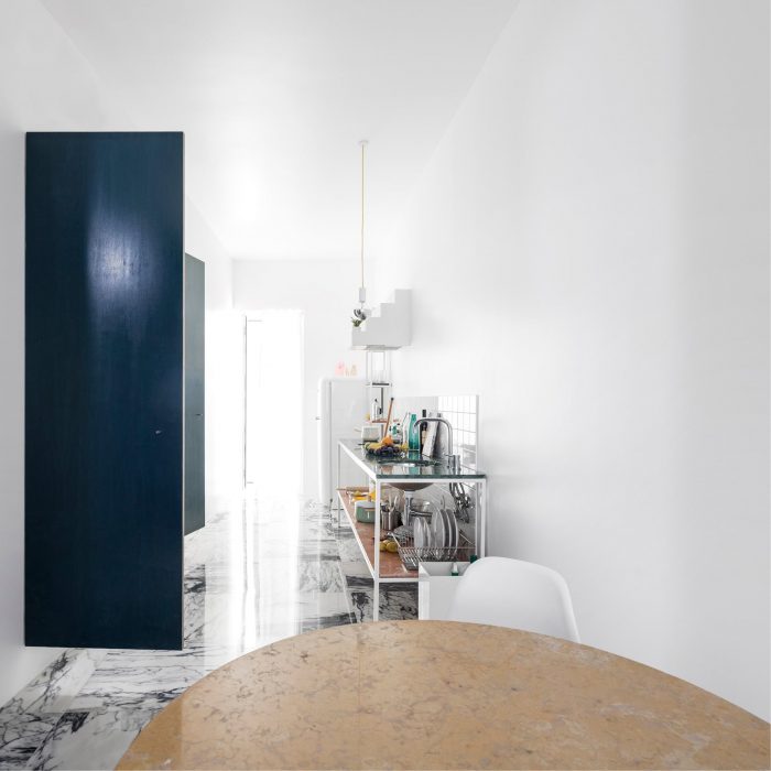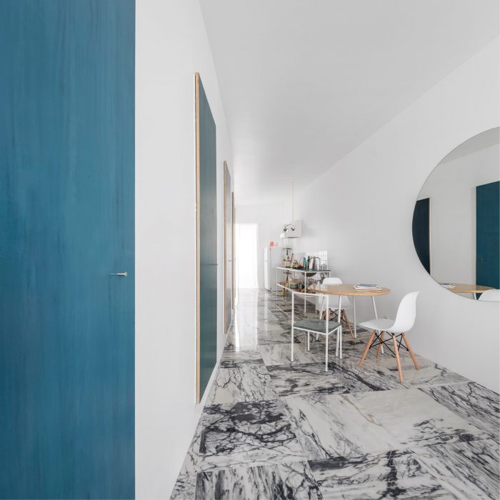 The long main space serves as living but also as dining and kitchen area; it is a living gallery rather than a living room. Its curved wall is punctuated by hand-painted doors in different shades of blue, hanging detached from the floor like a set of monochrome paintings. There is a carefully calibrated clash between the lightness of the curve and the rigidity of its elevation.