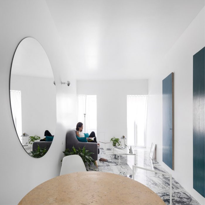 The apartment lies in an unremarkable building in Lisbon. Its obsolete fragmented typology presented a series of small rooms, some devoid of natural light, and an impractical exterior bathroom. The intervention aimed to erase these faults and to clarify the use of the available surface: a gently curved wall was extended from façade to façade, defining the limit between a vast common space and the different private rooms.
