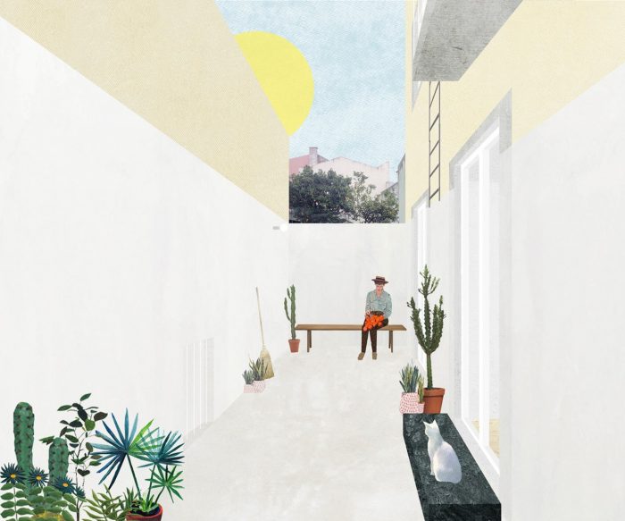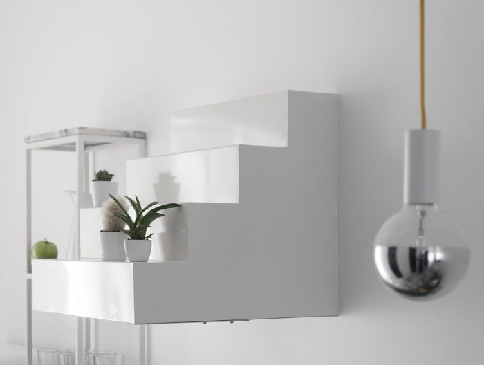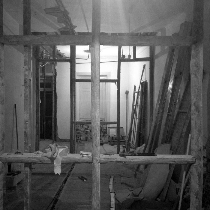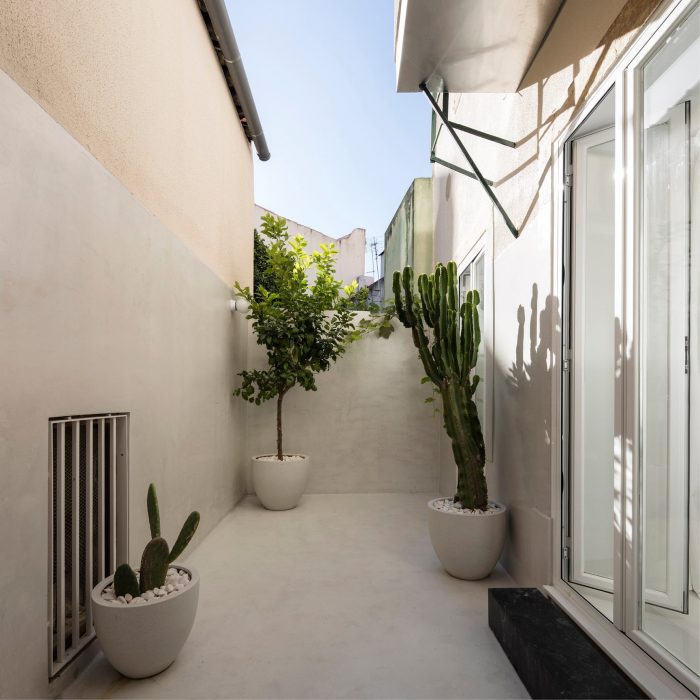The materials and orientations of the floors underline the functional distinction through the apartment. A small roof area was reclaimed behind the back façade: the new courtyard-like space provides an exterior addition to the living room, natural but unexpected for an apartment on a second storey.