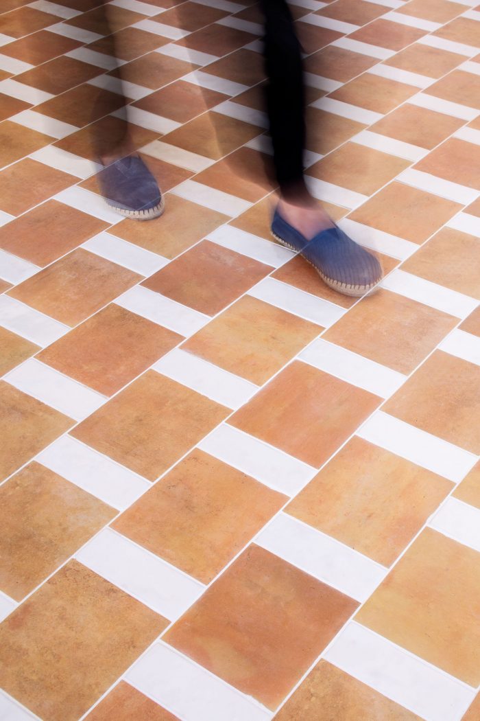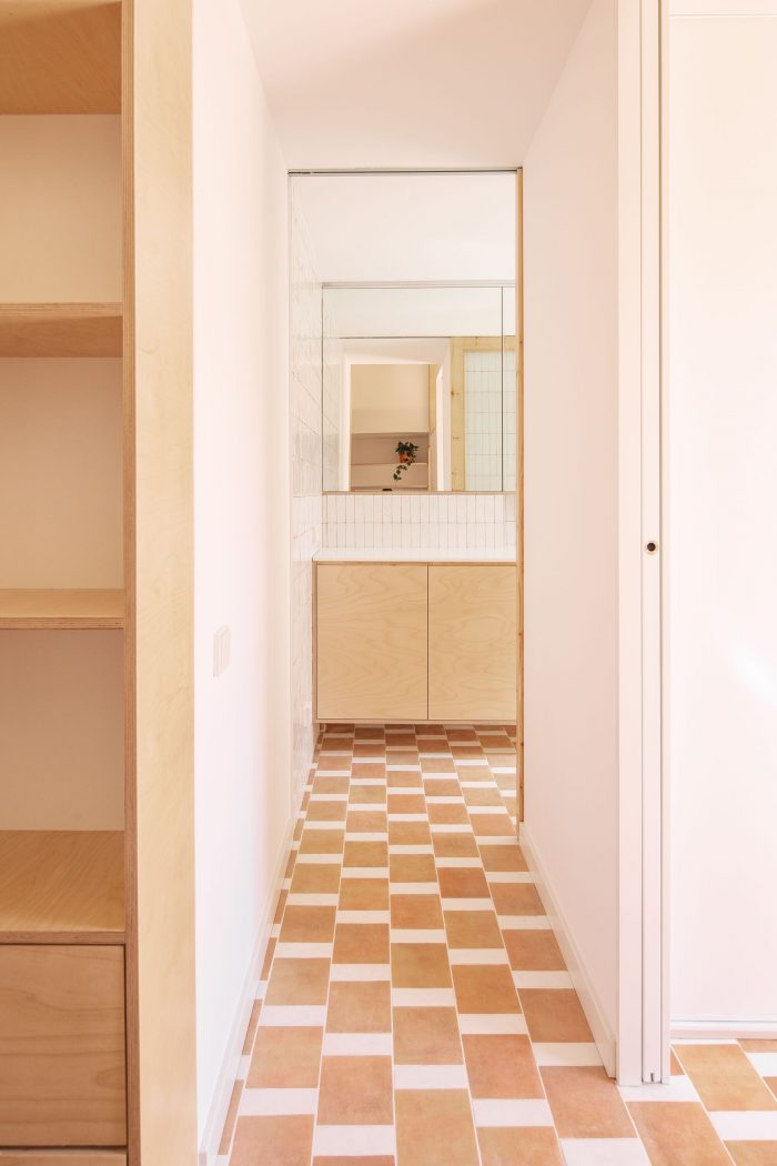 A new continuous flooring, the same for the whole house, combines the color white with fired clay, small pieces to create a greater sense of spaciousness.
