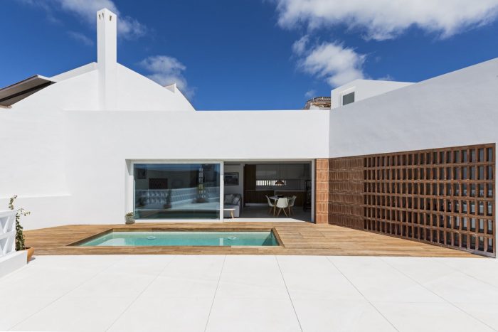 房子的入口是在一个安达卢西亚的天井里。这个传统的空间为我们进入房子的中心以及接下来的视觉爆炸做了准备。在客厅之后,我们可以看到楼梯区,用一个老砖头照亮。夜间区域恢复了原来的项目立面,保持了传统房屋的形象,除了双高窗。