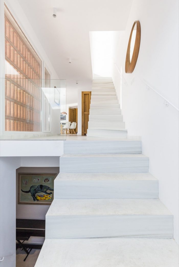The entrance to the house is across a Andalucian patio. This traditional space prepares us to get into the heart of the house and the visual explosion that follow it . After the living room , we can see the stairs area, lighted with an old brick jalousie . The night area recover the original project facade , keeping the image of a traditional house, except the double height window .