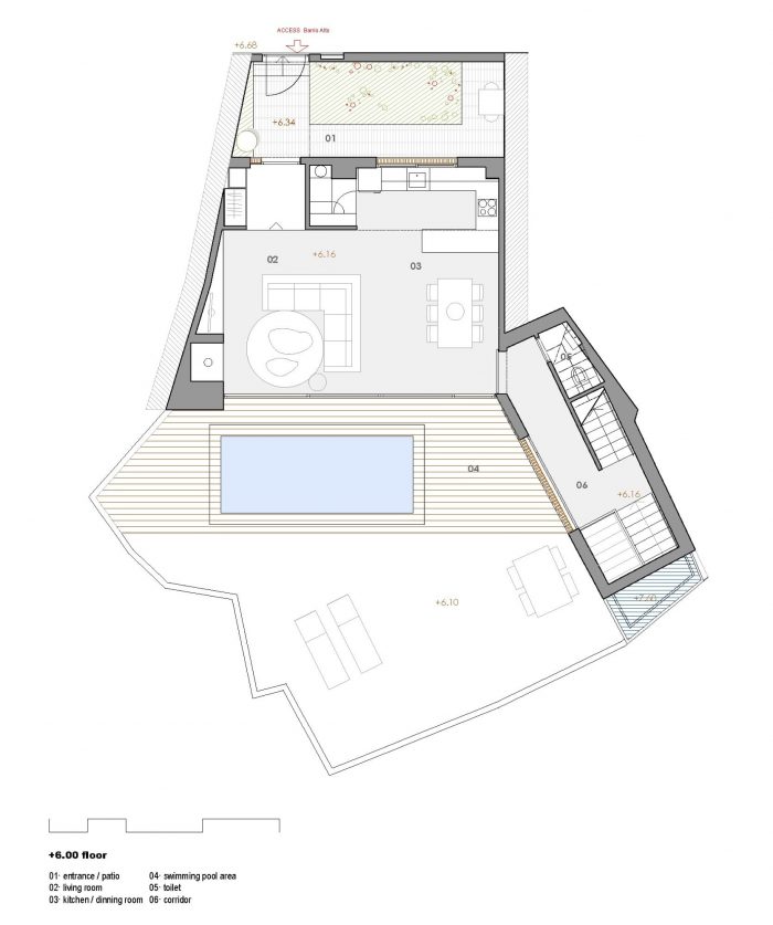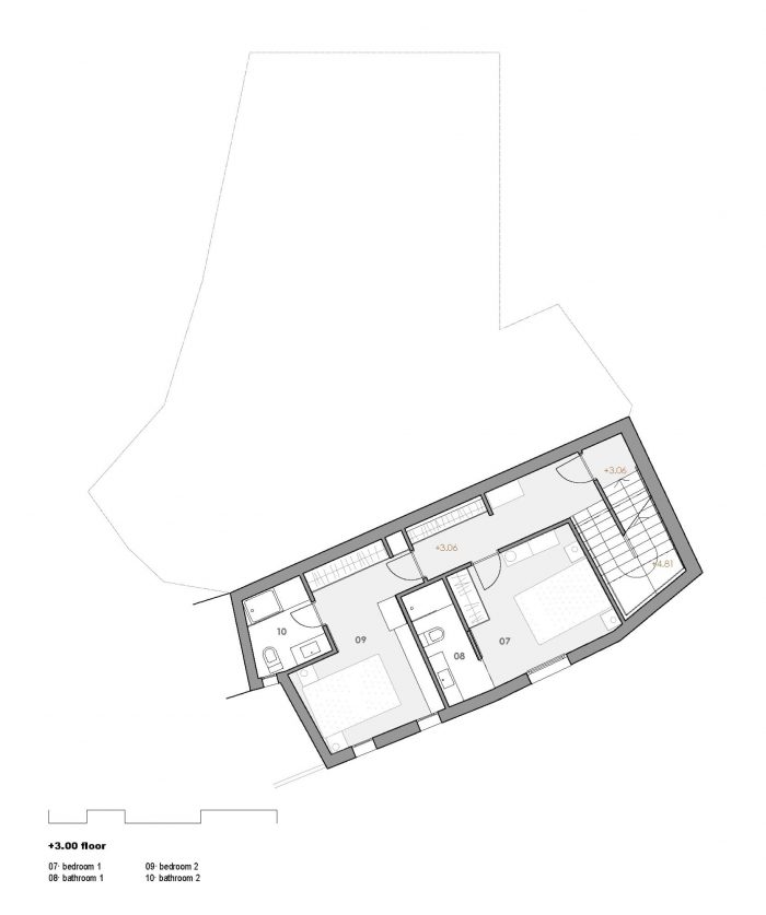 高处的地块(最后加入的拼图)将成为生活区。游泳池将矗立在空闲的地面空间里。其余的户外区域是夜间区域的屋顶。卧室在露台下面,位于第一个项目地块。在地面上,就在卧室的下面,有一个供客人使用的公寓。楼梯将是将拼图分类的元素。这一重要性通过天窗-凸窗得到了强调。