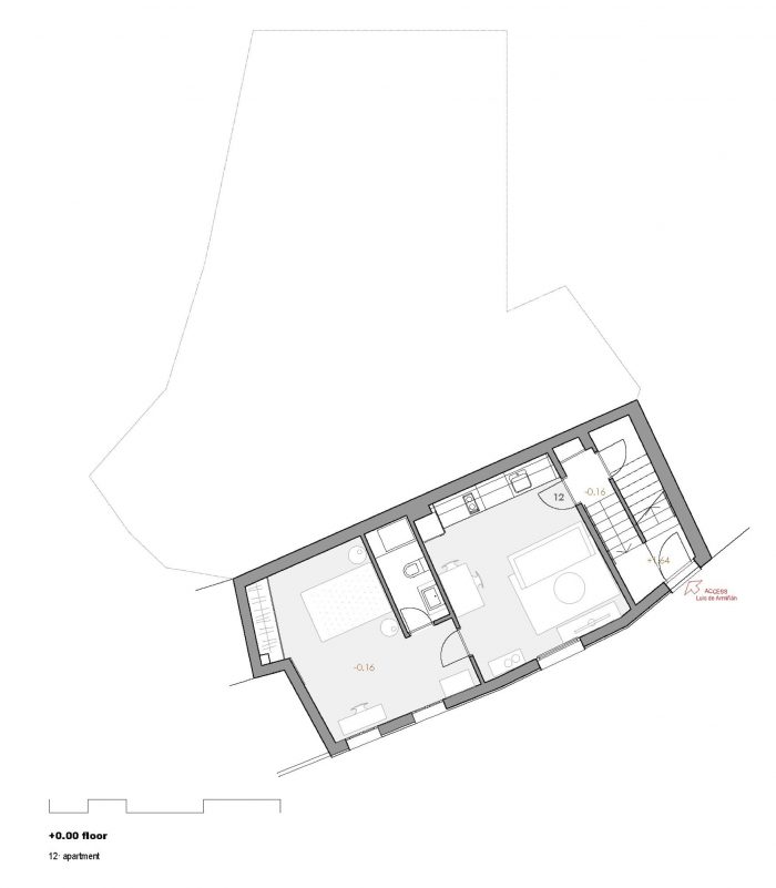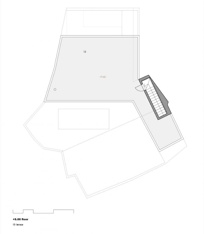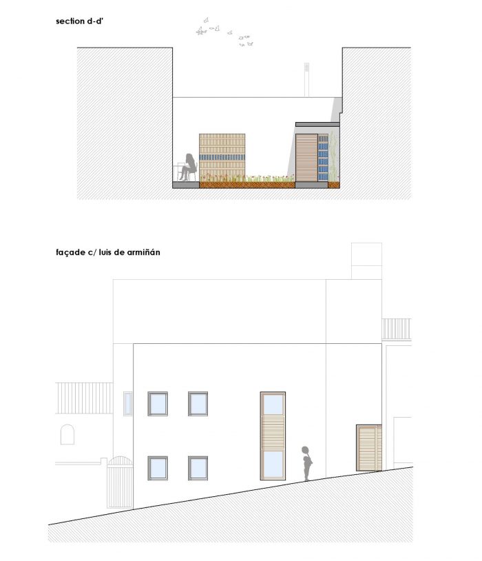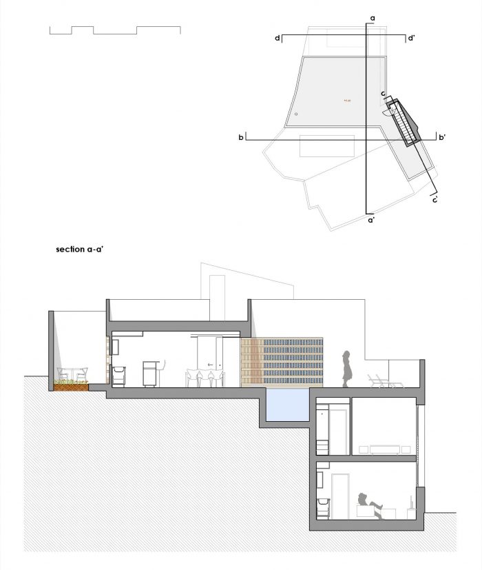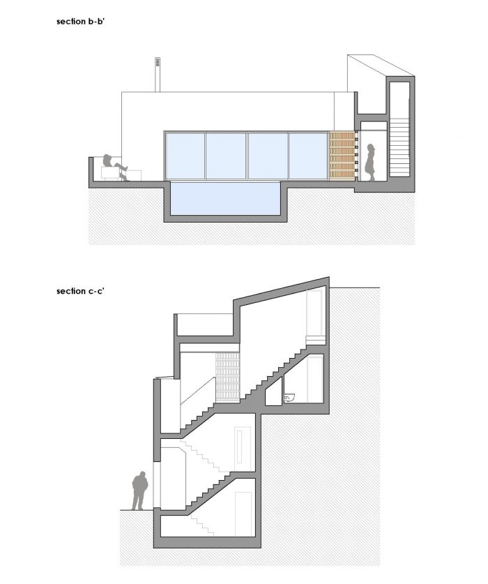 The higher plot (the last added to the puzzle) will be the living area. The pool will be stand in the free ground space available. The rest of the outdoor area is the roof of the night area. The bedrooms are below the terrace, sited in the first project plot. In the ground level, just below the bedrooms , there is an apartment for guests. The stairs will be the element which will sort the puzzle . This importance is highlighted with the skylight – bay window