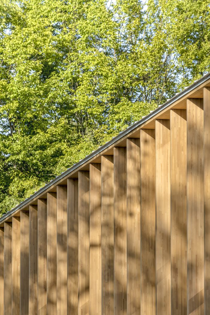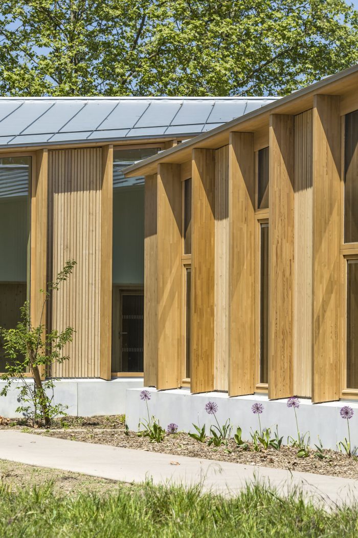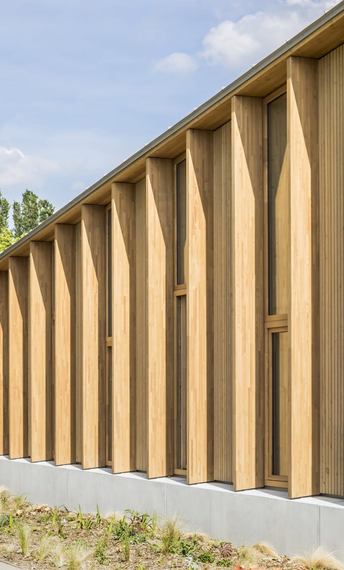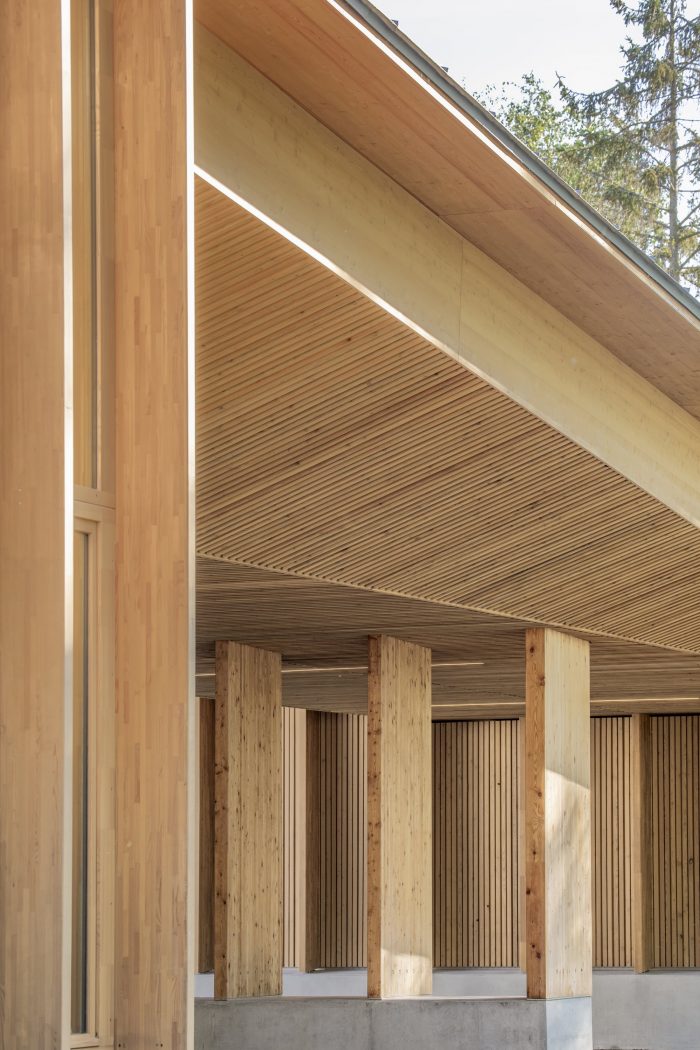 环境建设是由木质结构组成的。这种生物基材料以各种形式被使用:木质屋顶、木质框架墙、落叶松覆层、开口和内部云杉木制品。围护结构的水密性经过仔细研究和实施,以限制能量损失。