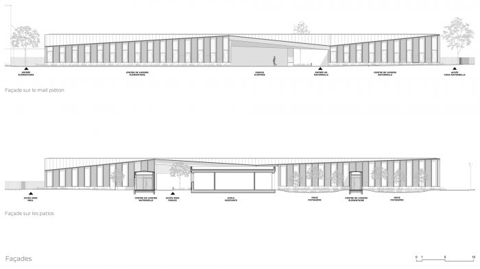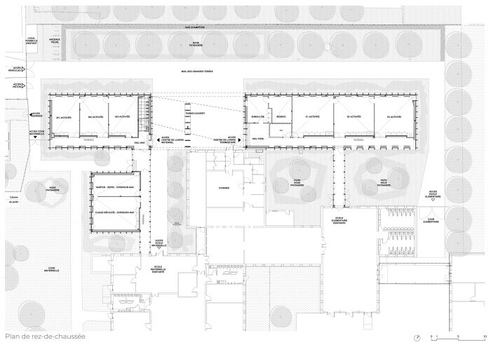该项目的目标是为该地提供一个城市化的环境,并为学校提供一个新的外墙。沿着主立面,一条以树木为界的轴线重新定义了学校的所有入口。