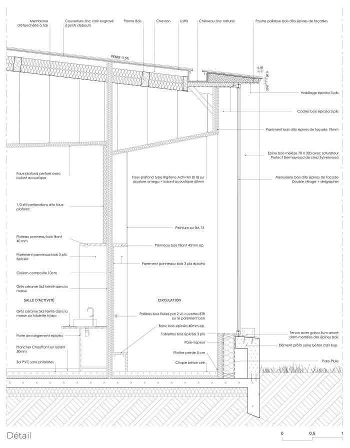 The environmental construction, is made of wooden structure. That biobased material is used in all its forms: timber roof, wood frame wall, larch cladding, openings, and interior spruce woodwork. The watertightness of the envelope has been carefully studied and implemented to limit energy loss.
