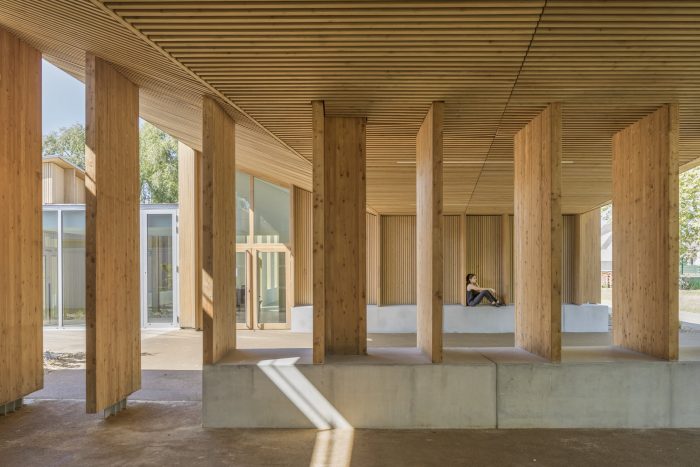 The new building connects the school to the recreation center through fully glazed circulations that cross the landscaped patios.