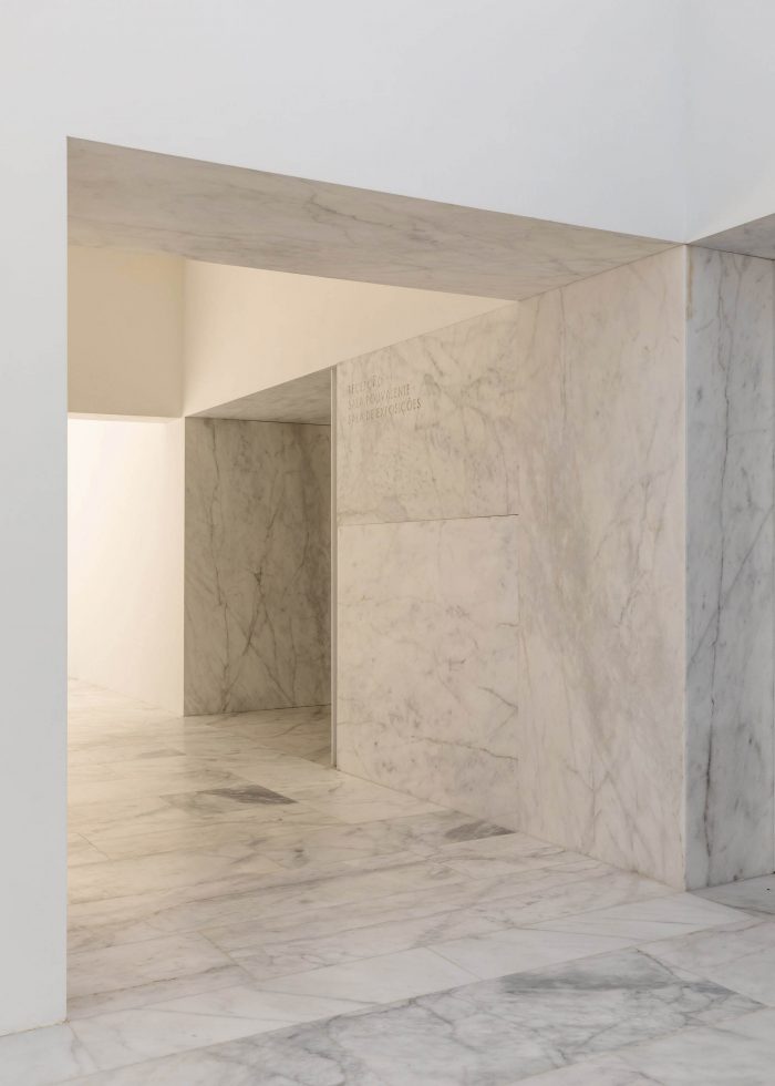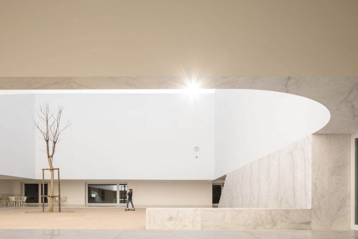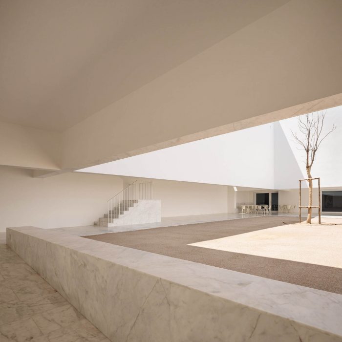 One enters through a cloister, which constitutes the main room of the building and which creates the pause that precedes the function, the moment when the movement soothes down and the noise is replaced by the delicate sound of the running water in the fountain, which marks the arrival. The galleries around the central courtyard generate paths that promote a gradual adjustment of scale, evoking protection and shade, and guiding the way around the gravel court and the jacaranda tree that is planted there.