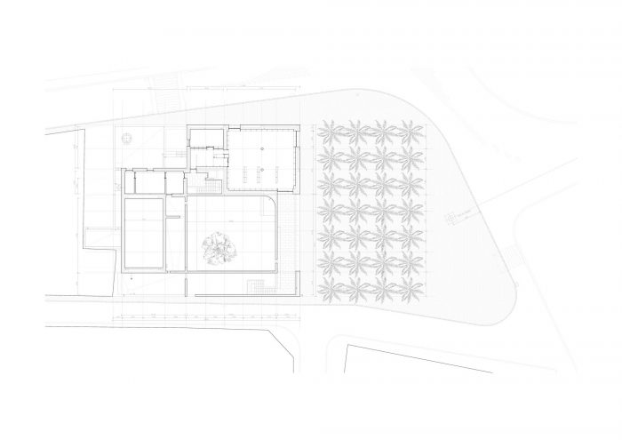 The Grândola’s new Library and Municipal Archive is accessed through the set of palm trees that structure the renovated Praça da República, now purged of all the noisy and conflicting elements, which have been removed from there in search for a more pacified order. This square is the central place of the city and the epicenter between the Municipal Garden, to the southwest, and the Orange tree garden, to the east.