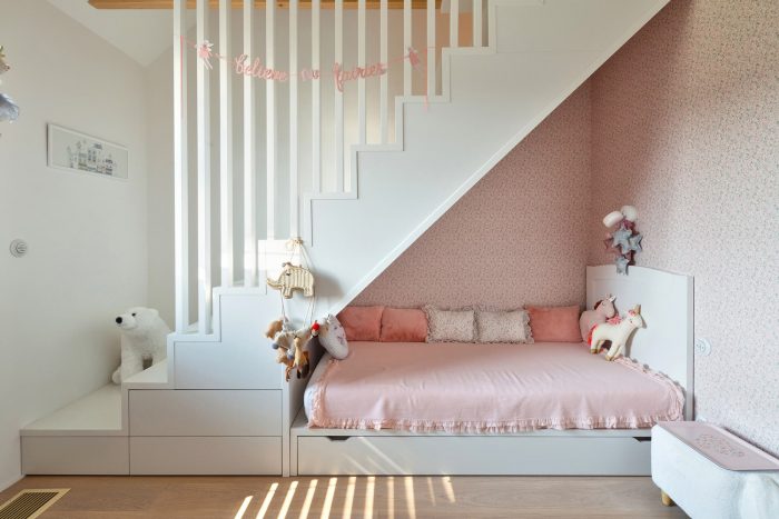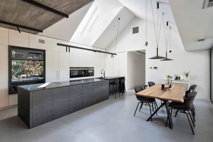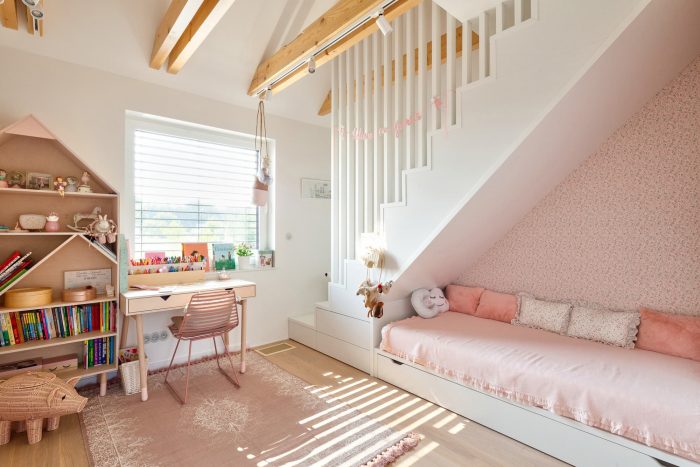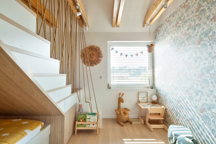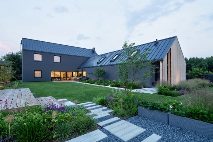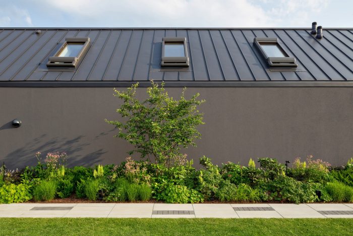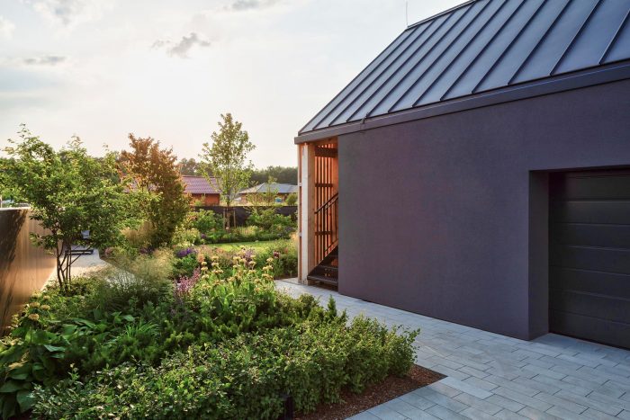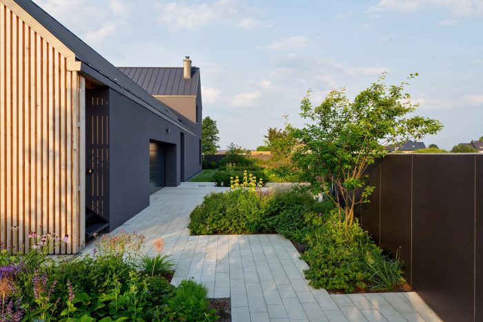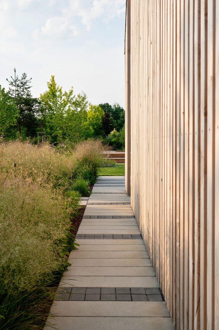The interiors are designed in gray and white tones. The exception is the children's rooms. Diverse plant species, friendly to pollinators and local birds, were used. That enriches the biosphere of the area. The materials used for the surface and street furniture elements refer to those used in the building. It makes the garden an extension of the house.