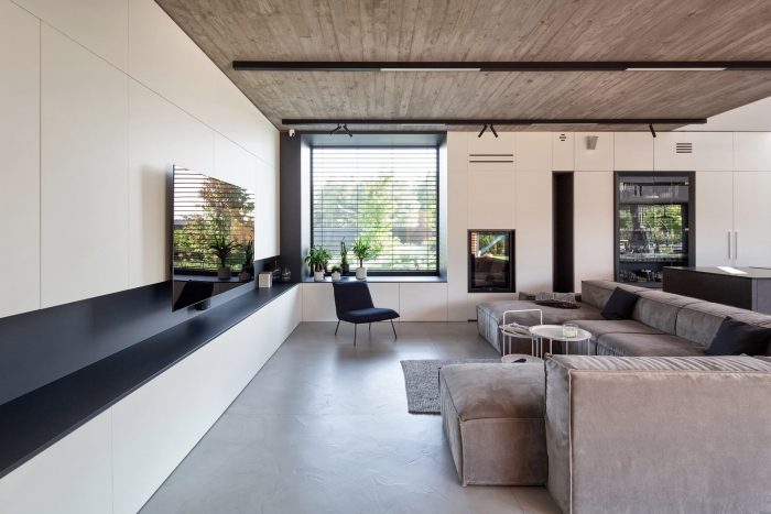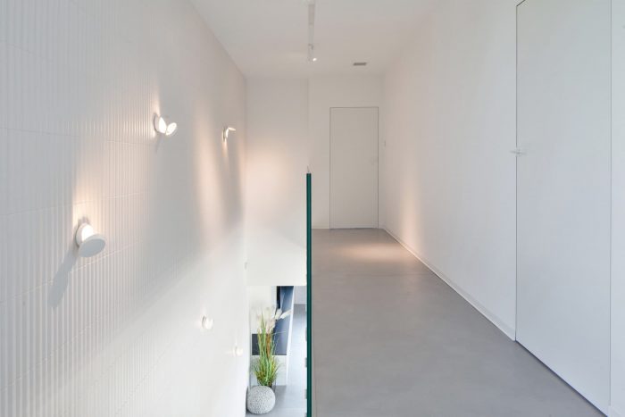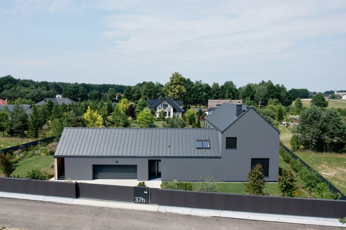 The monochromatic house was built on a flat plot, with an entrance from the south side, in the urbanizing part of Świerczyniec. The L-shaped layout of the building makes the garden zone hidden from the street. The layout of the building is rotated according to the directions of the world. Thanks to it, the garden zone with the terrace is exposed to sunlight earlier.