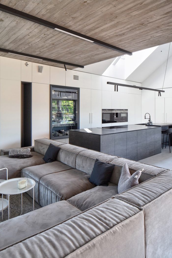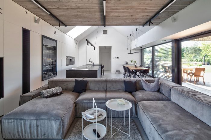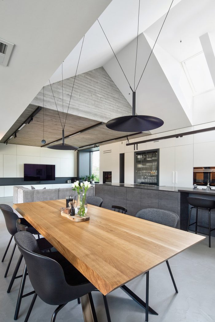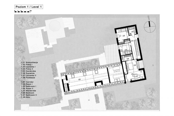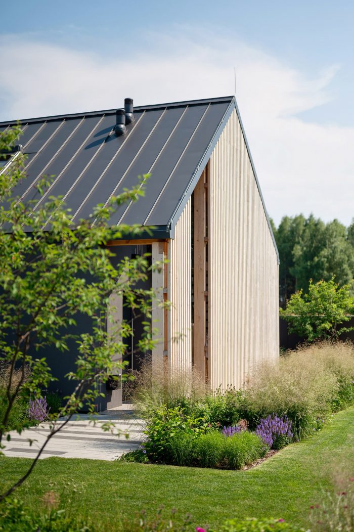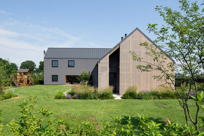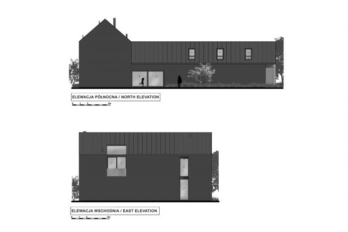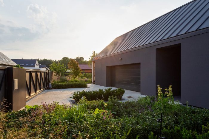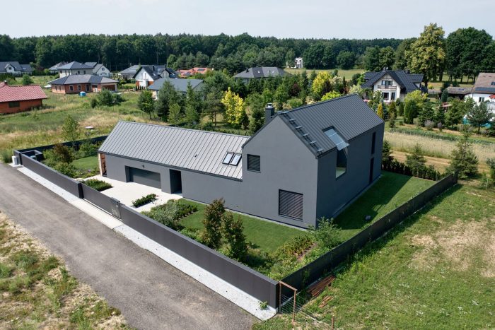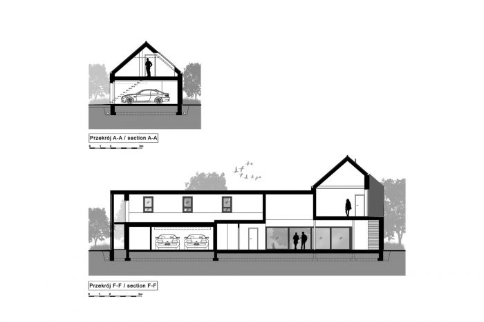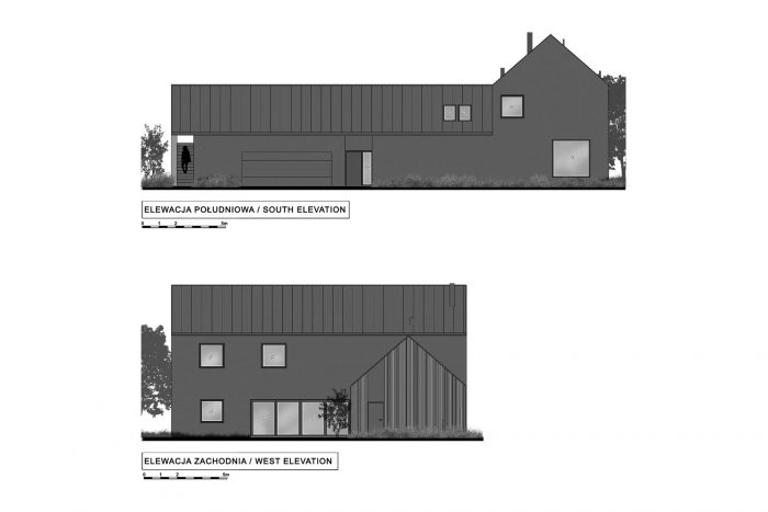 The building consists of two parts with different heights covered with gable roofs. In the lower part, on the ground floor, there is located a garage, an entrance zone, and part of the day zone. The attic has a space zone that can perform various functions. In the second, higher part, rooms are in a classic arrangement with a bedroom and children's rooms on the first floor, lit from the east and west.