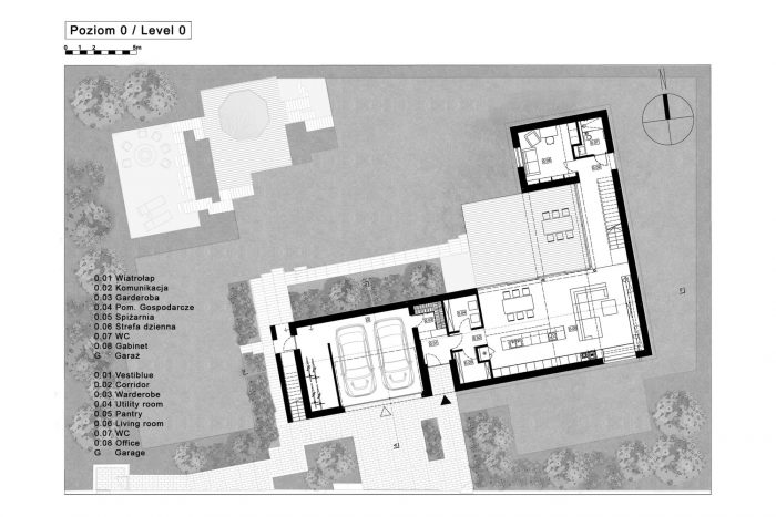 单色的房子建在一个平坦的地块上,入口在南侧,位于Świerczyniec的城市化部分。建筑物的L型布局使花园区从街道上隐藏起来。建筑的布局是根据世界的方向旋转的。由于它,带有露台的花园区更早地暴露在阳光下。