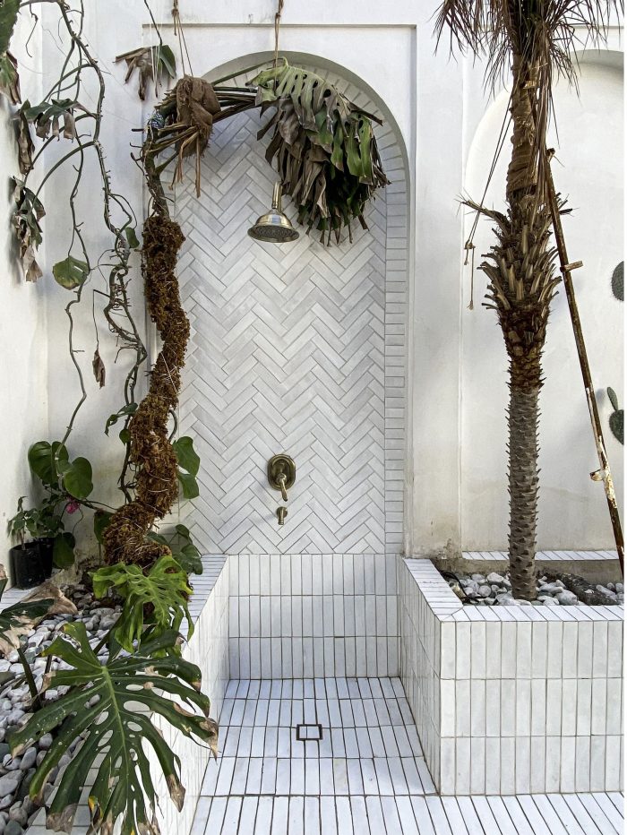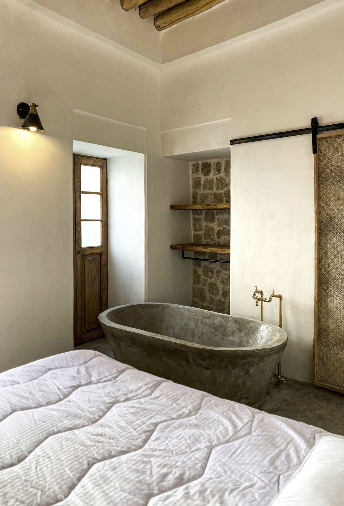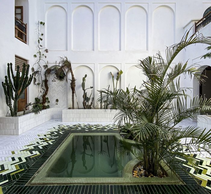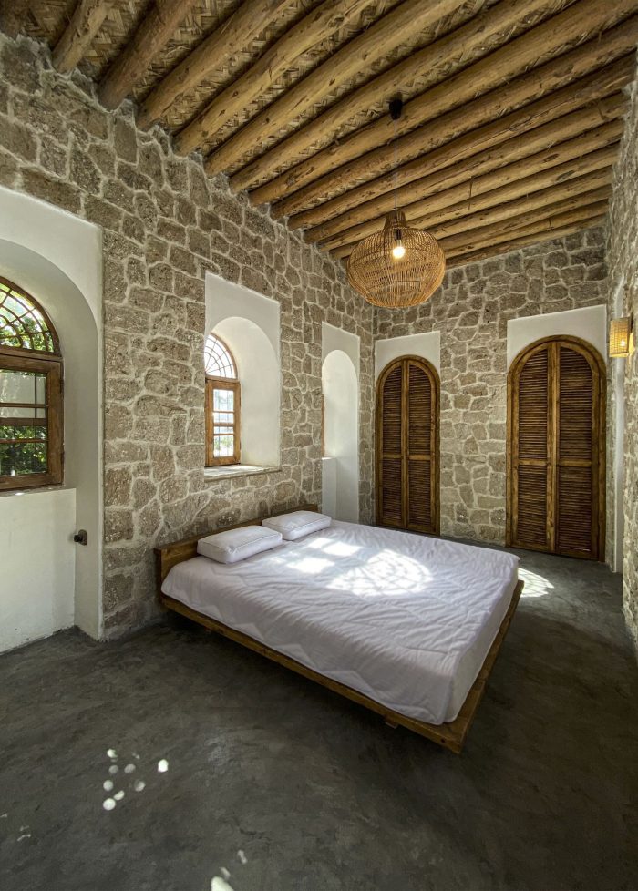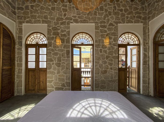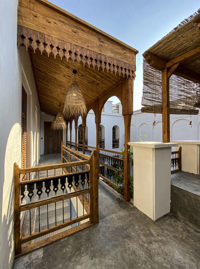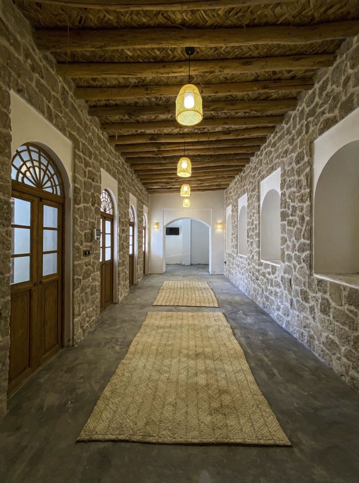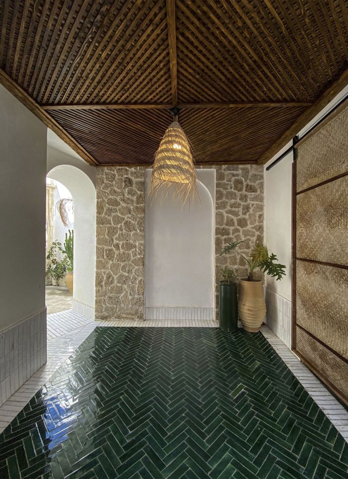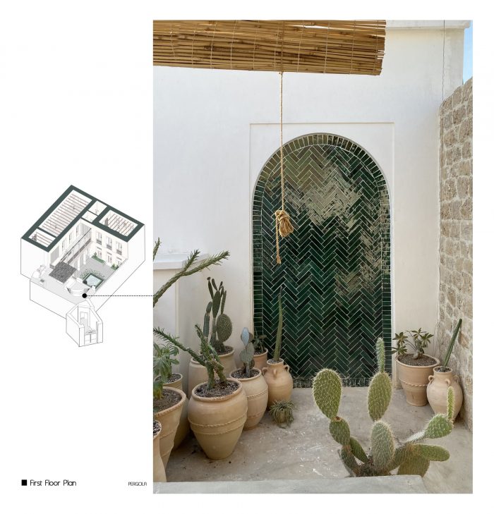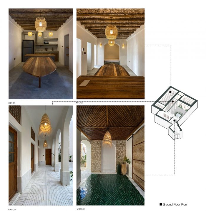 The fourth step: Using original patterns and completing the design process with changes related to the identity defined for the project while adapting to the patterns studied today along with considering the ability to build a workforce and indigenous construction materials in the area. (Renovating the terrace and building a Shena’shil-a local terrace instead of it, building a small pool in the middle of the yard, handmade floor tiles with a metaphor of the mat texture pattern, making lighting pendants with local materials, reno-facades, and the entrance foyer, etc.)