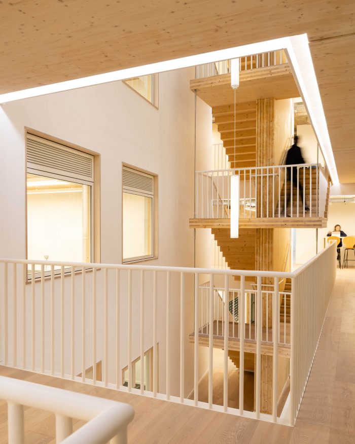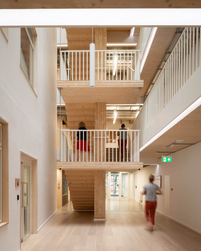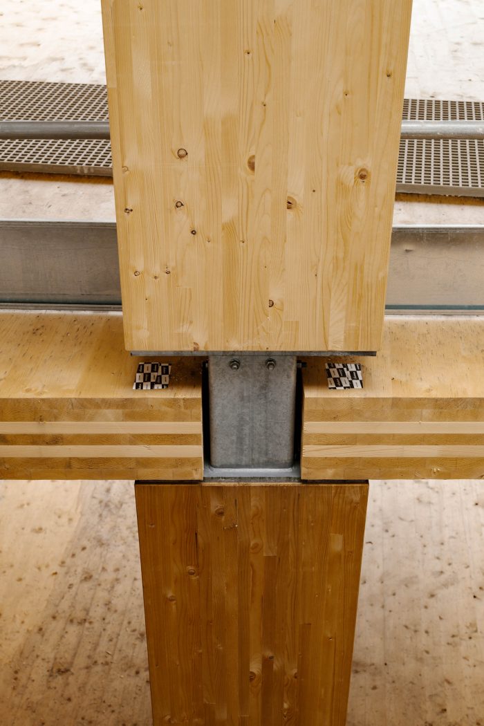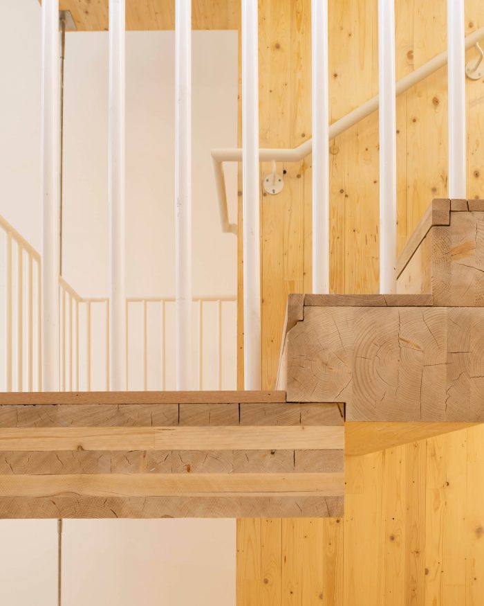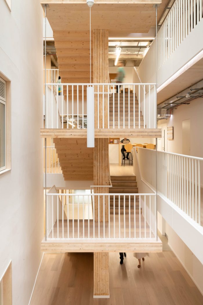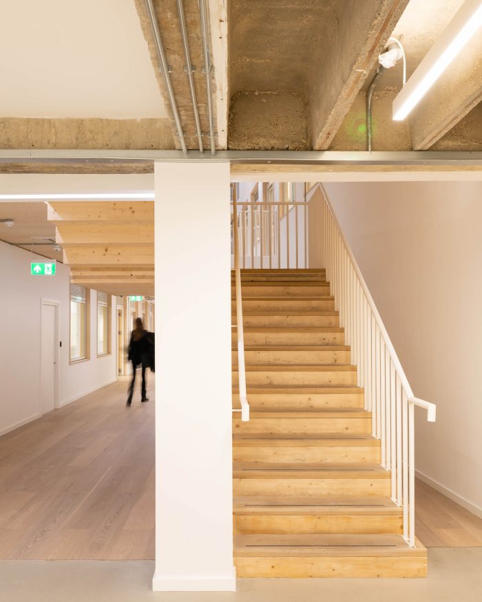 用可再生资源--木材建造的扩建部分和楼梯将建筑的碳足迹降到最低。该结构是交叉层压木材(CLT)和胶合层压木材(glulam)的混合体。没有向下的横梁,允许灵活地细分办公室以满足租户的需求。混凝土框架和CLT扩展在结构上是相互独立的。两个结构相接处的活动接头使它们可以独立移动。特色的楼梯主墙与混凝土框架相连,使其可以垂直移动,但不能水平移动。