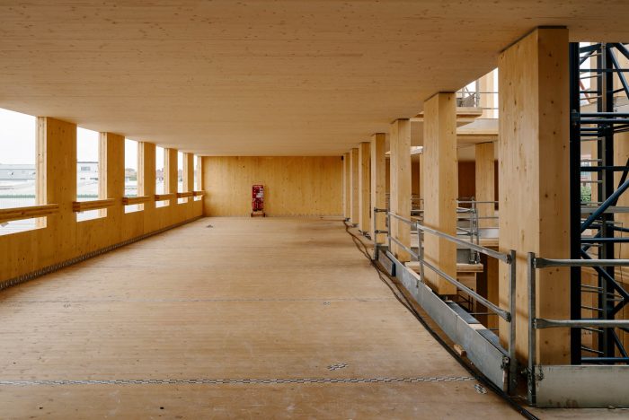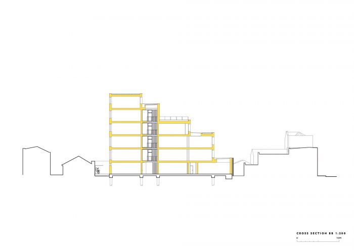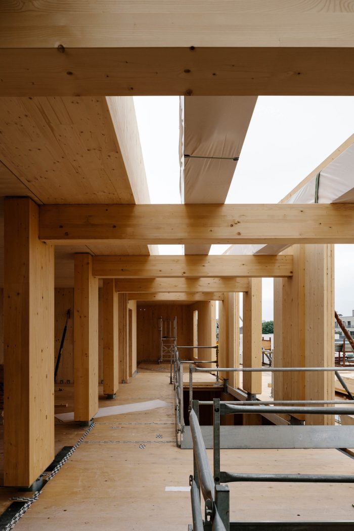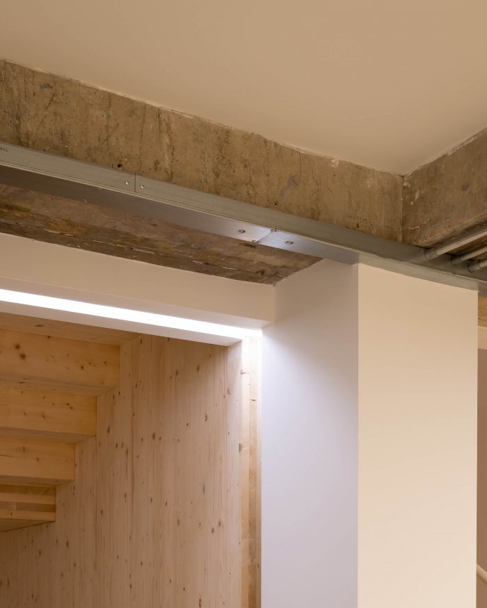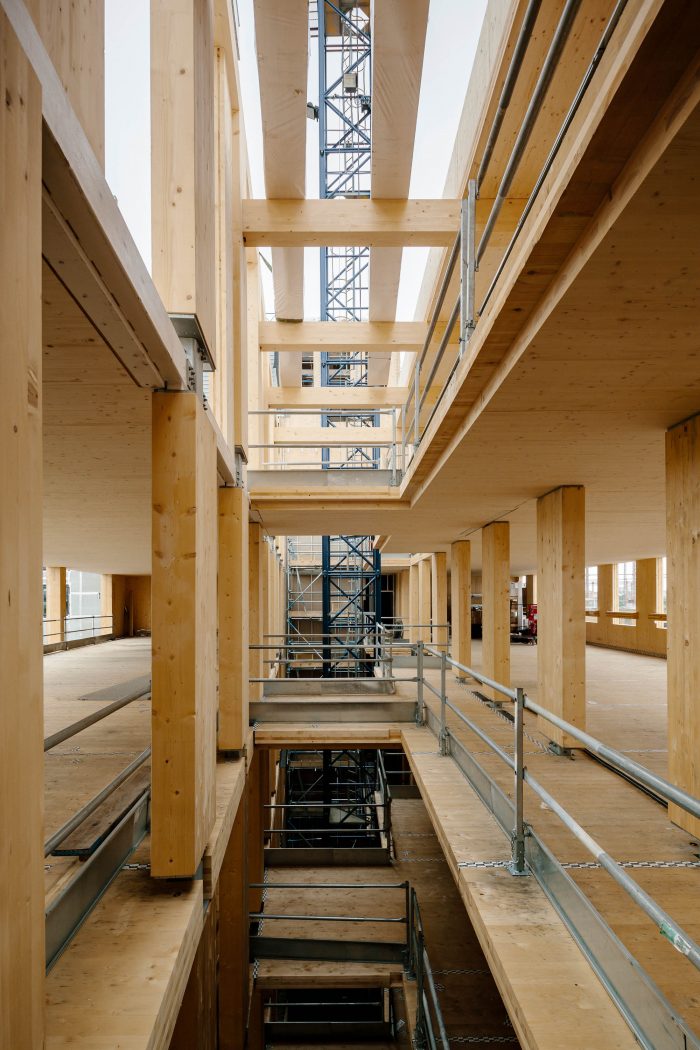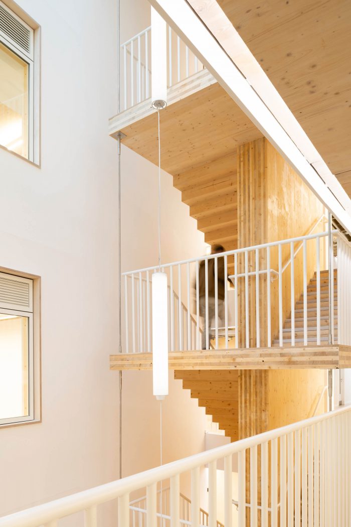 用可再生资源--木材建造的扩建部分和楼梯将建筑的碳足迹降到最低。该结构是交叉层压木材(CLT)和胶合层压木材(glulam)的混合体。没有向下的横梁,允许灵活地细分办公室以满足租户的需求。混凝土框架和CLT扩展在结构上是相互独立的。两个结构相接处的活动接头使它们可以独立移动。特色的楼梯主墙与混凝土框架相连,使其可以垂直移动,但不能水平移动。