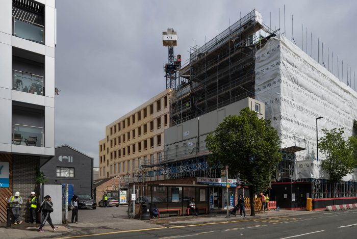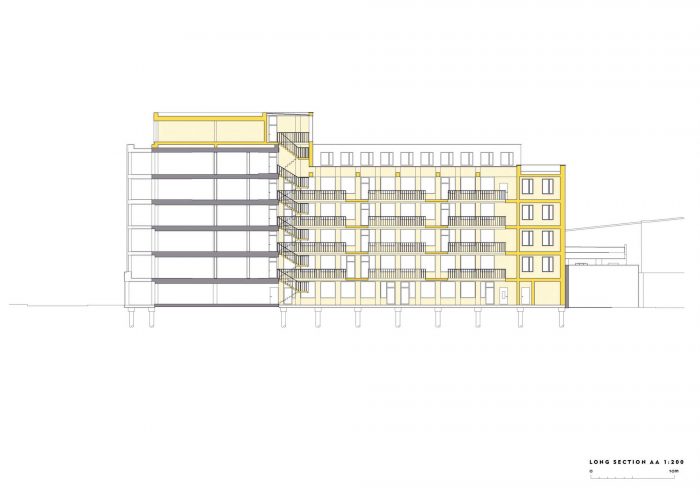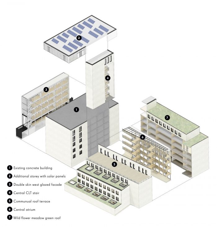 All services are exposed. The omission of plasterboard and suspended ceiling systems minimises material use while making the replacement of services quick and easy. The external cladding is a fully breathable, self coloured lime render on solid wood fibre insulation. There is no need for painting the facade and the regular maintenance this requires. Low water use sanitaryware minimises water consumption, and energy usage is reduced through low energy light fittings. Roof mounted PVs generate power to serve the common areas and a wildflower meadow on the roof brings biodiversity to this inner city site.