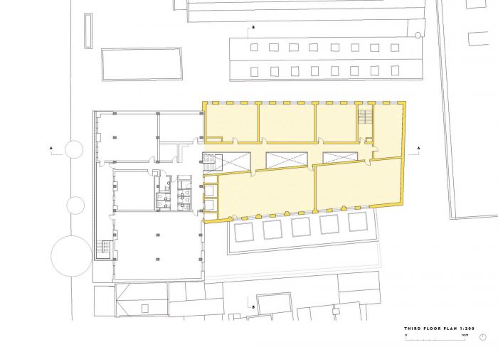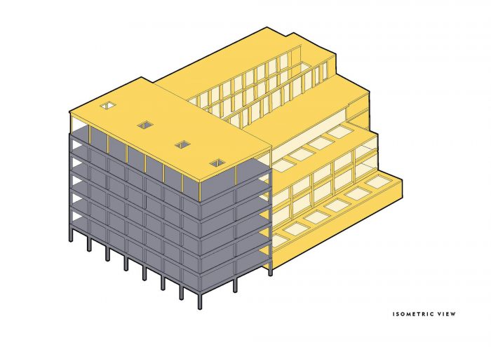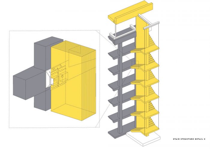 Constructed from timber, a renewable resource, the extensions and stair minimise the building’s carbon footprint. The structure is a hybrid of cross laminated timber (CLT) and glued laminated timber (glulam). There are no downstand beams, allowing flexibility in subdividing the offices to suit tenant’s needs. The concrete frame and the CLT extension are structurally independent of one another. A movement joint where the two structures meet allows them to move independently. The feature stair spine wall is connected to the concrete frame allowing it to move vertically but not horizontally.
