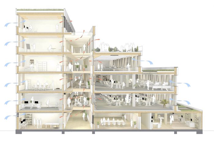 绿屋的设计是为了最大限度地减少建筑在施工和运行中对环境的影响。一系列的工程木材扩展使混凝土结构恢复了活力,提高了建筑结构的性能,使其适合作为现代办公空间使用。