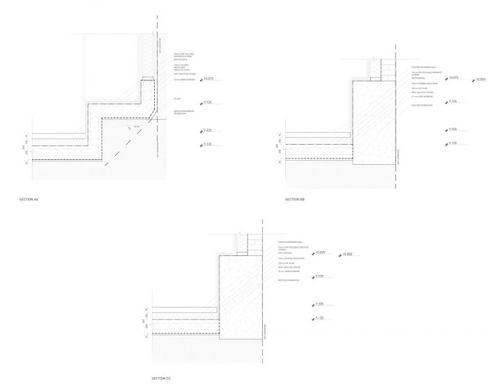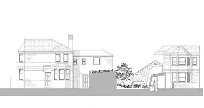 The split levels and grounded form helps to conceal its mass and facilitates the flowing ground- scape transition between the garden and studio. Clad in a stainless steel mesh the terraced planter beds and wild flower green roofs will combine to green the facade replacing the lost habitat.