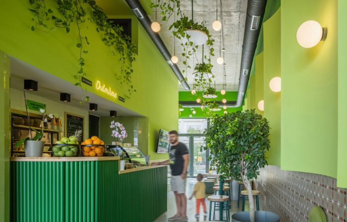 既然Green and Protein作为一个专营店代表着健康的食品和饮料,那么还有什么比引入一个 "健康环境 "的设计更好的呢。