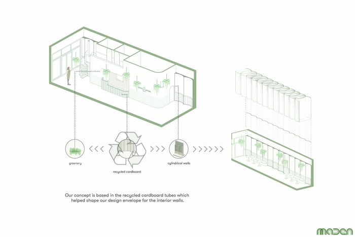 We get to feel the entire experience in this project, where the major idea for this design comes from recycled cardboard tubes that were employed as parts in creating the design as a whole, whether it is for walls or the bar.