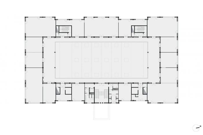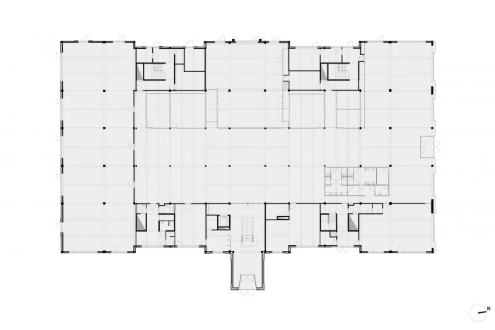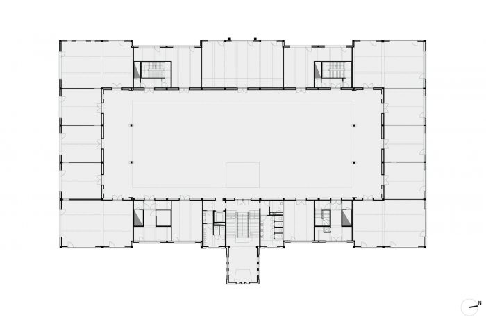 该计划包括四个新的核心,包含技术井和建筑内的流通。这些核心也构成了一个新的悬挂式屋顶结构的支柱,该结构在容纳技术设备的同时,实现了一个引人注目的中央中庭。围绕着这个位于二楼和三楼的中庭,历史上的办公室被改造成现代设施,并最大限度地保留了现有元素的特征。中庭也将被修复。