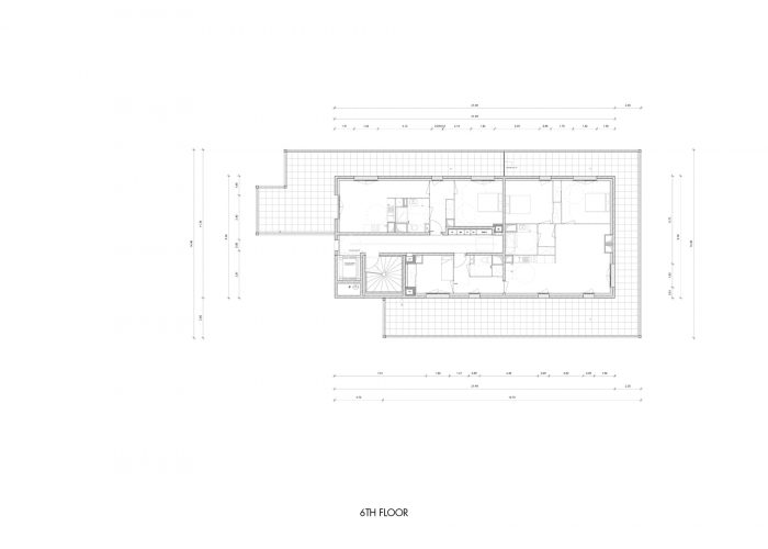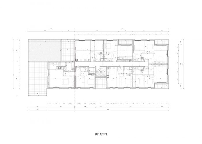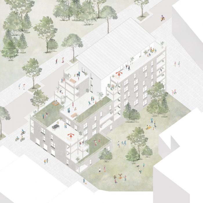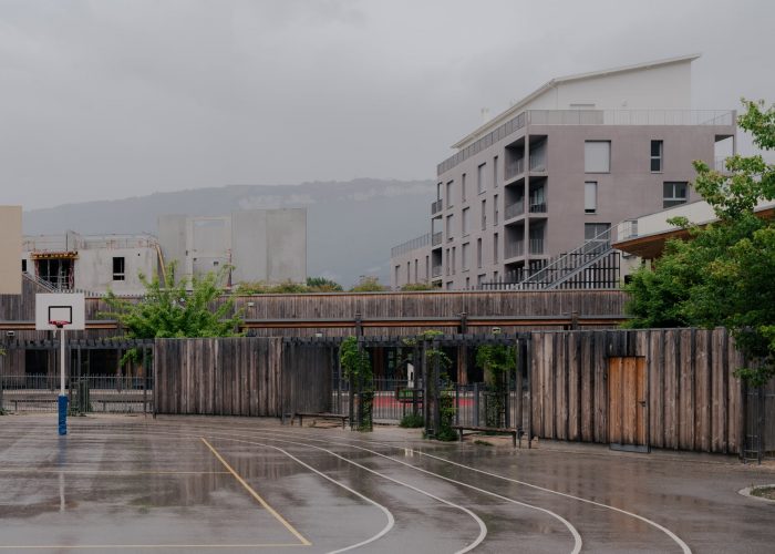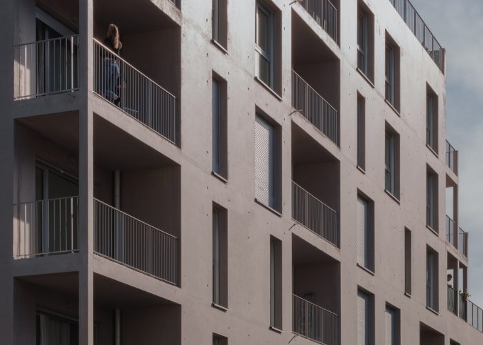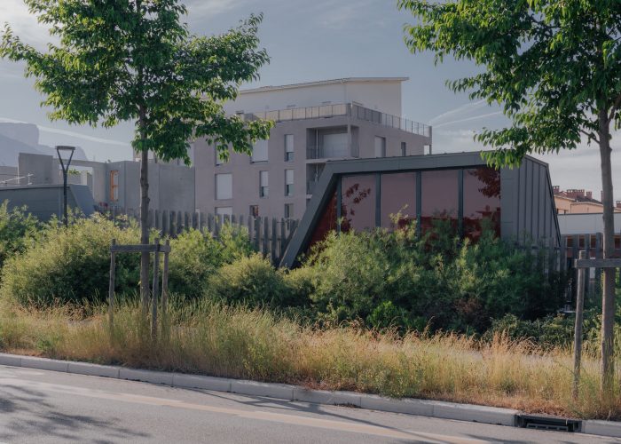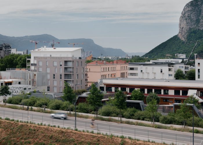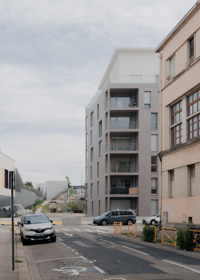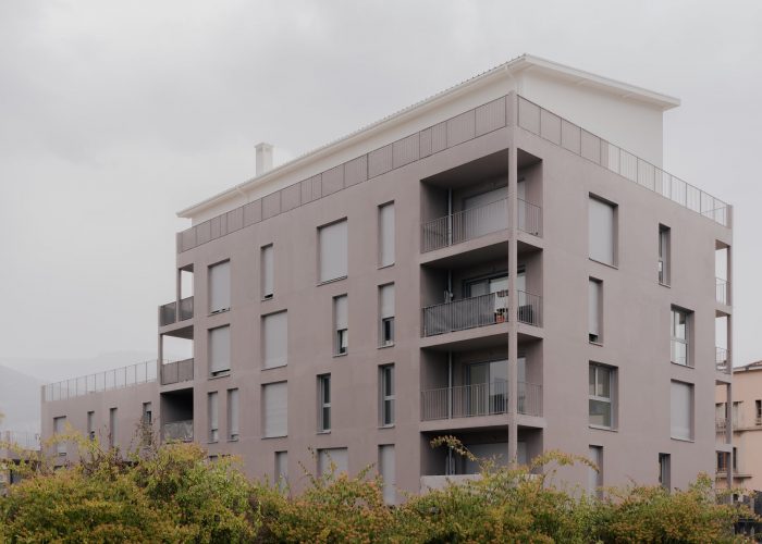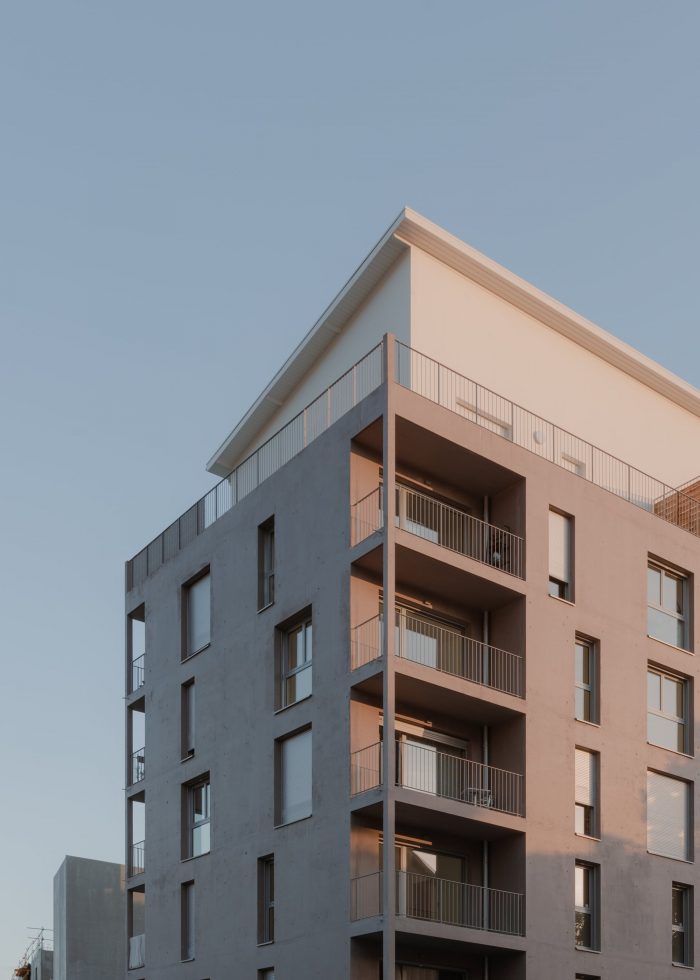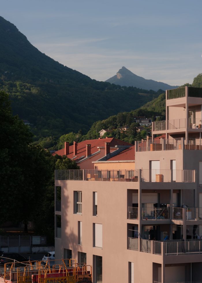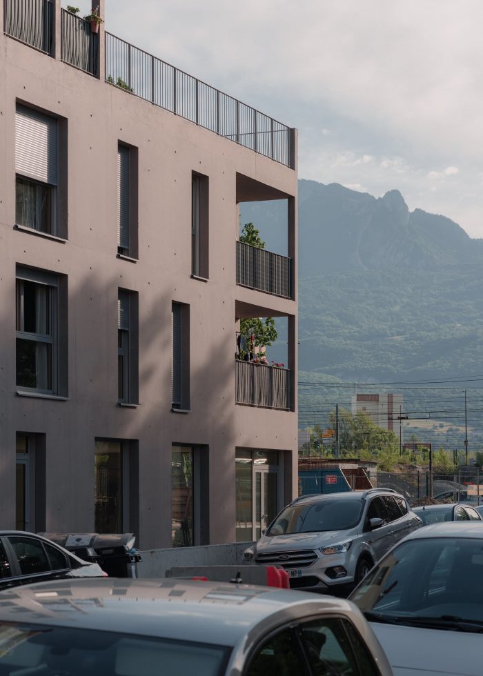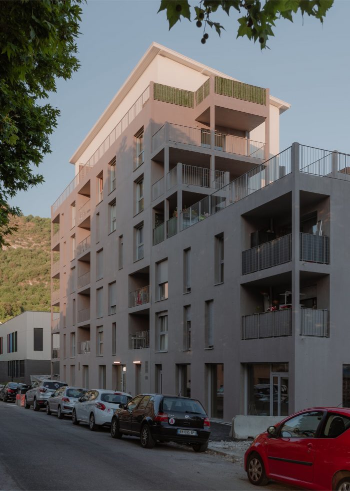 The project is located in a rapidly developing area in the heart of the city of Grenoble (France), at the foot of the mountains, close to the train station, and on the edge of the railway tracks. The construction is built in a volumetric continuity with the two neighboring buildings: plot DP1 (office building) and plot DP3 (housing building). We have worked on a set of bleachers/terraces that connect to the levels of the neighbors and which adapt to the orientation of the sun in order to ensure optimal exposure to the living rooms.