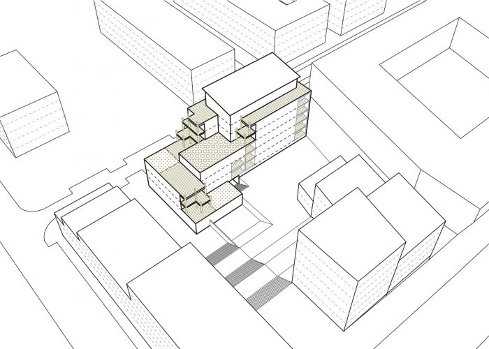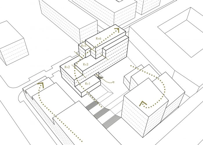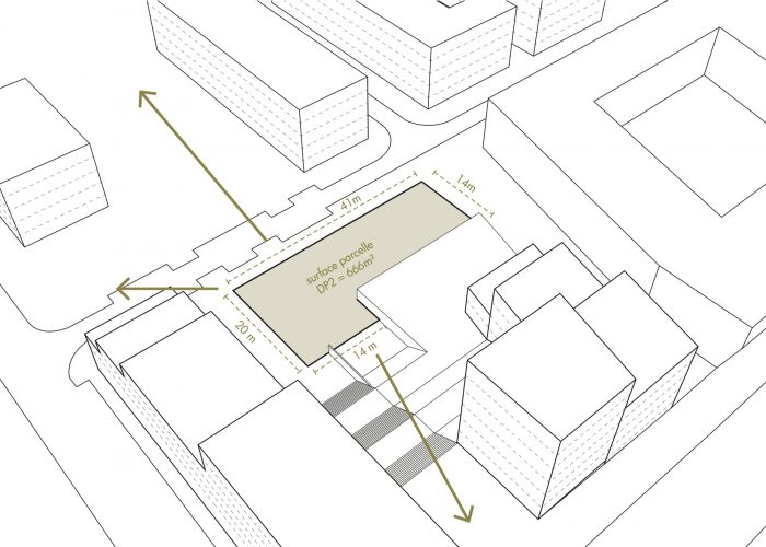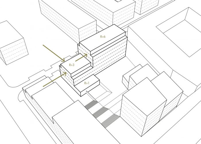 The challenge of the project is to take advantage of this situation by relying on urban prescriptions, by organizing a volumetry that knows how to both dialogue with the surrounding buildings and the future buildings along the central crossing of the block.