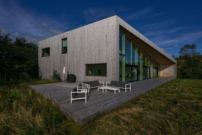 Given the Norwegian weather, with its regular rainfall, Saunders decided to create a vast porch over the main entrance area to the rear of the villa that would help shelter family and friends whatever the conditions. The clients wanted to garage for two cars and storage space, so Saunders wove these elements into the design in conjunction with the porch and integrated them into the overall shape and composition of the house. Such elements helped to influence the dynamic form of the building, as the design process stepped from inside to outside and back again.