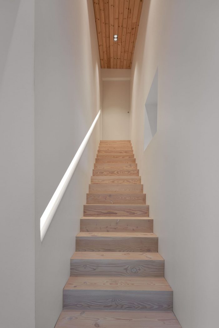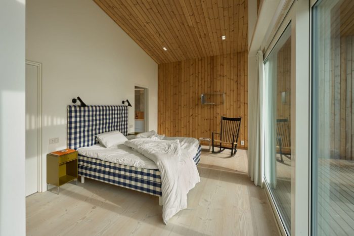 Saunders’ clients were particularly pleased with the joinery and the level of detailing and craftsmanship achieved by carpenters Nilsen & Andersen both inside and outside. The use of different woods and timber finishes, including Dinesen white spruce for the floors, white painted spruce boards for the ceilings, and pine for the cladding, creates a sense of cohesion but also offers subtle textural contrasts; the use of wood also improves the acoustics of the houses and reduces any sound reverberation. Yet, for the family, perhaps the greatest pleasure comes from the way that the house connects so vividly with its surroundings.