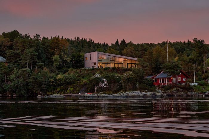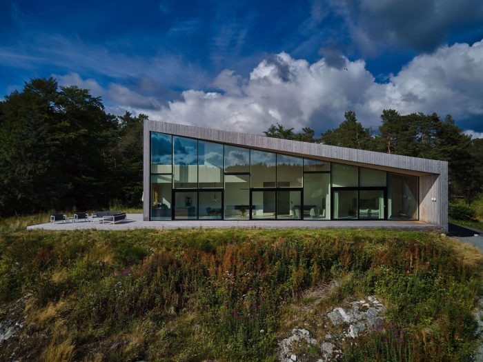 别墅坐落在一个平缓的山丘上,俯瞰峡湾,在水边有一个独立的船屋和一个浮桥。这座房子有一种雕塑般的表现力,有一个单坡屋顶,灰色的木材包层,还有一排玻璃可以看到开阔的视野。设计过程中的一个关键因素是决定将所有的主要生活空间和主人套房放在地面上,同时创建一个适度的上层,容纳两个孩子的卧室和一个媒体室。在底层,该计划是通过对实用性和功能性的仔细考虑而演变的。
