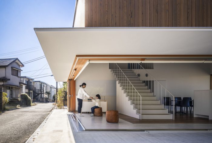 The site faces a quiet alley with no through traffic, and the deep eaves made of a hybrid structure of wood and steel integrate the common space inside the building with the surrounding environment of the site, creating a rich expanse. The wide entrance under the eaves is a place for residents to take off their shoes at their own pace, and a trick for local people to stop by with their shoes on their walks and spontaneously become familiar with this facility.