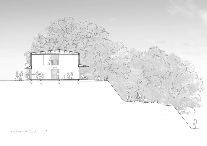 一系列像游轮一样的遮阳窗不仅给私人房间带来了安全感,也是为那些希望过上平静生活的住户提供的装置,即使在突如其来的雨中也不必惊慌失措。 它配备了一个雨水箱、一个手动泵、一个应急发电机和一个用于做饭的燃气/电力炉,以便在发生灾难时可以作为一个福利庇护所使用。 通过将雨水用于场地上设置的菜地,计划在日常工作中愉快地利用防灾设备。