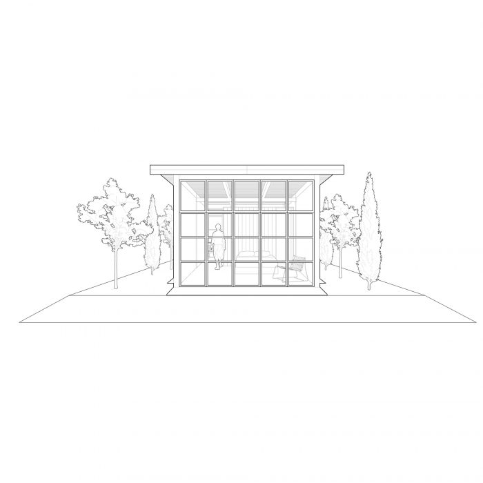 建筑方案要求有一个带顶灯的大浴室和一个卧室/书房。在那里,夫妻俩可以直接与花园和自然接触,工作和休息,这可以通过折叠式外墙打开这种与外界的直接联系。