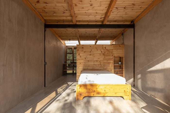 In terms of materiality, the palette was reduced to 4 materials: concrete for the foundation, laminated wood for the structure, bahareque earth for closures and copper glass for screens. The bahareque and wood support the recovery of the symbolic value of the land and the connection with nature, making the space thermally comfortable.